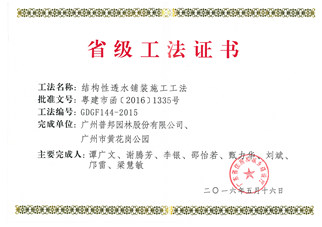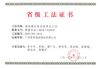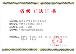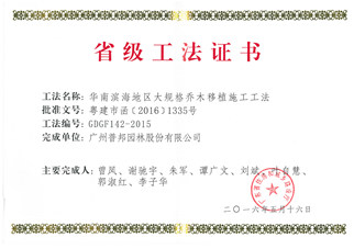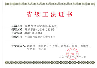 獲得省級(jí)工法16,含華南濱海地區(qū)大規(guī)格喬木移植施工工法(GDGF142-2015)、結(jié)構(gòu)性透水鋪裝施工工法(GDGF144-2015)、園林陡坡植物綠化施工工法(GDGF143-2015)、園林微污染水體凈化工法(GDGF198-2016)、園林水池防泛堿施工工法(GDGF199-2016)、園林生態(tài)景墻配置與施工工法(GDGF279-2017)、減低樓板荷載的節(jié)約型綠化種植施工工法(GDGF278-2017)、園林建筑免模板施工工法(GDGF674-2018)、園林水體生態(tài)景觀營(yíng)造施工工法(GDGF673-2018)、華南地區(qū)生態(tài)雨水花園營(yíng)建工法(GDGF202-2019)、華南地區(qū)輕型屋頂綠化營(yíng)建工法(GDGF203-2019)、濱海土壤排鹽堿及景觀營(yíng)建施工工法(GDGF204-2019)等。
