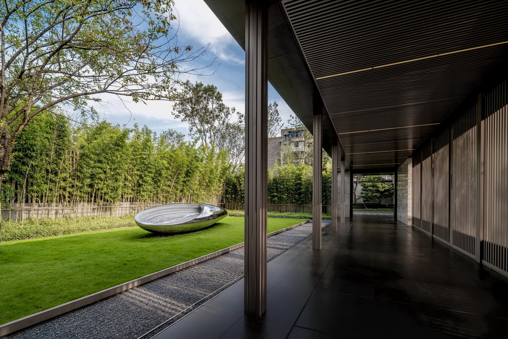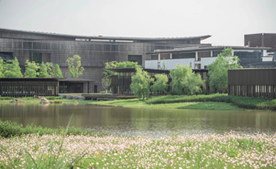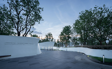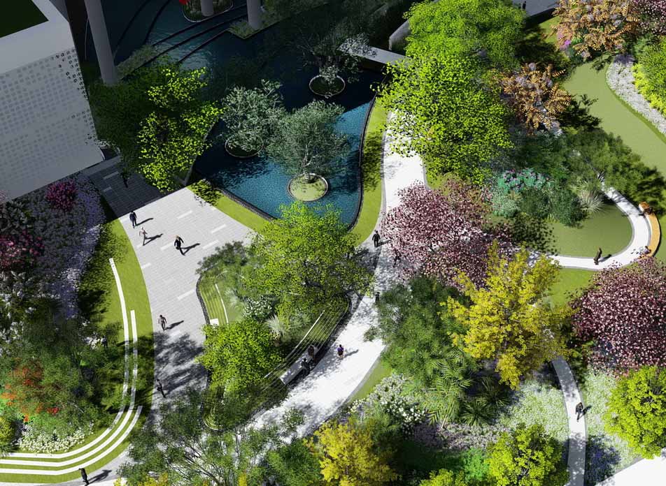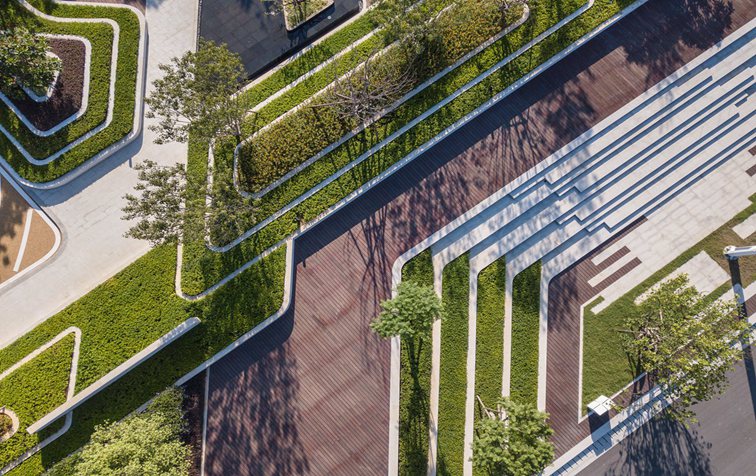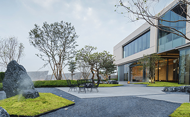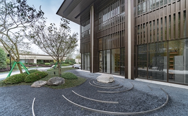 師法自然,致敬土地,從水鄉(xiāng)城中擷取山影、水境、樹聲為景觀靈感, 以“折疊花園”演繹當(dāng)代城中山水自然庭園,以簡約的造景手法續(xù)寫城市自然景觀形態(tài)。