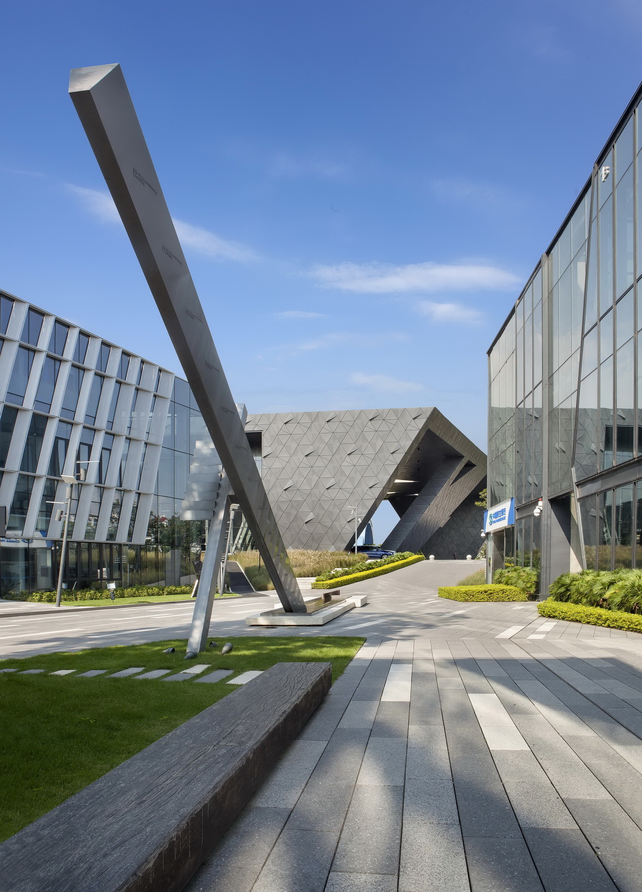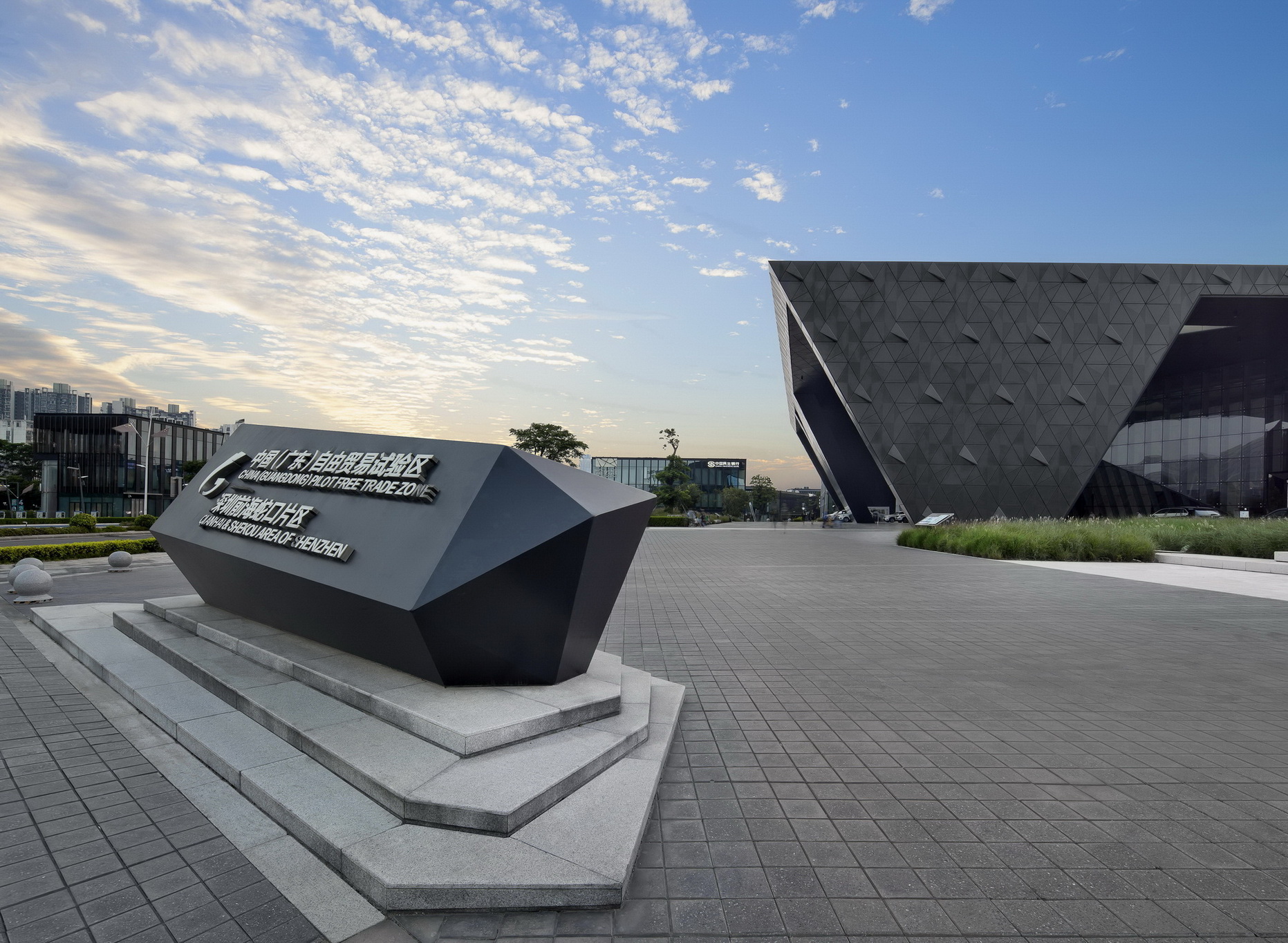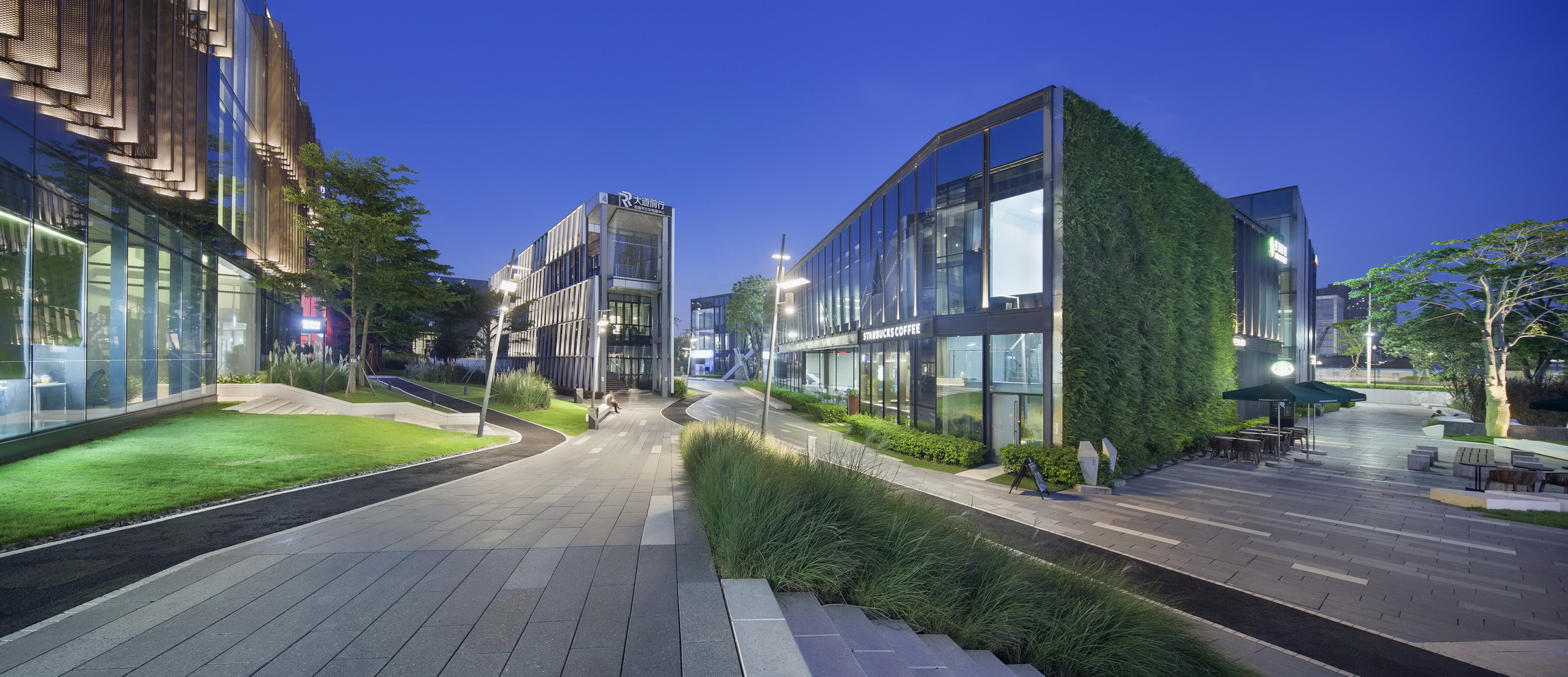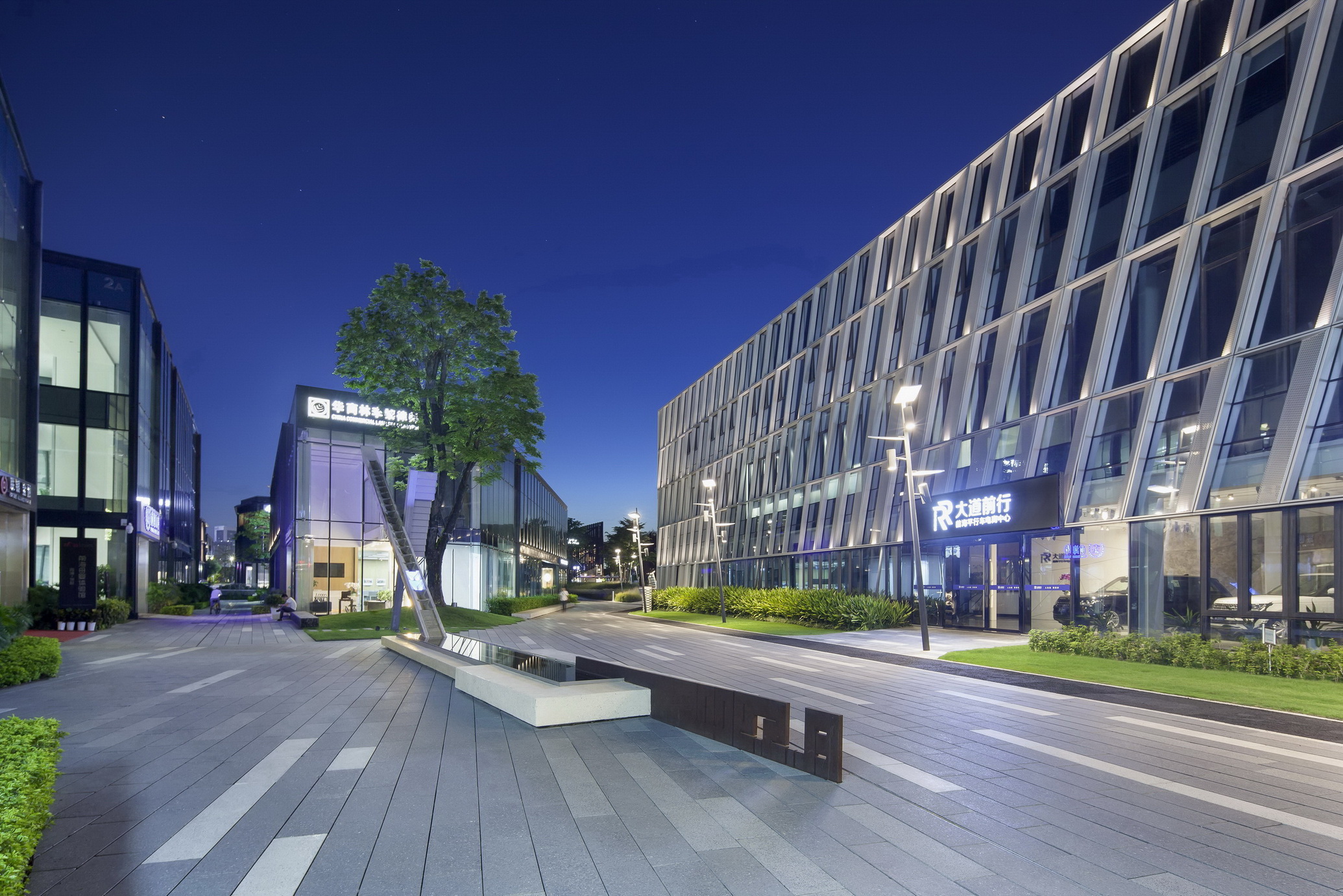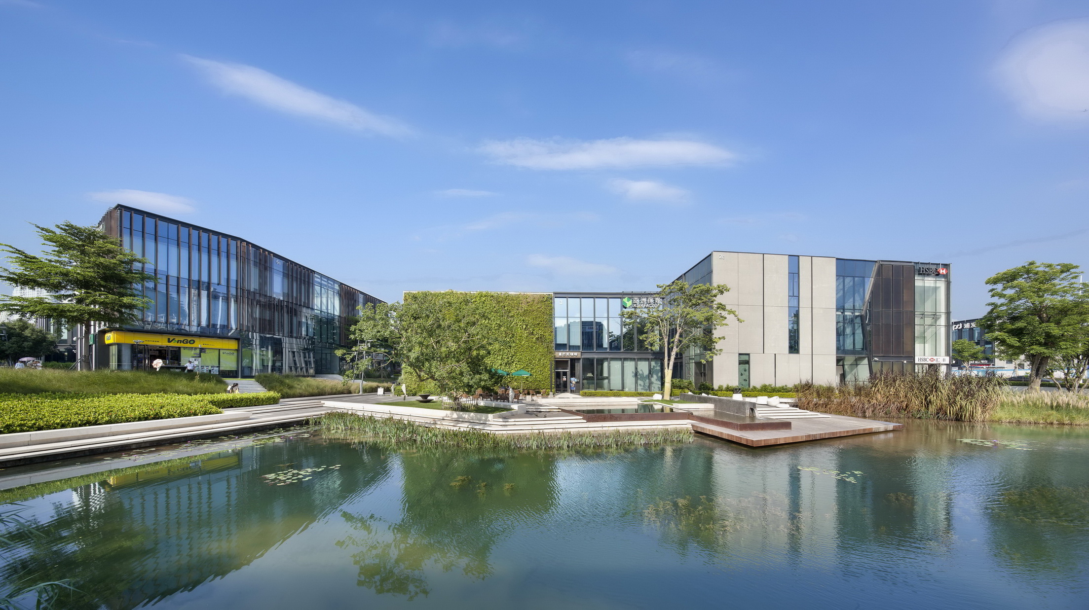 前海企業(yè)公館項目總占地面積約9萬平米,項目總建筑面積約為6萬平米,項目容積率約為0.6。整個項目分為特區(qū)館區(qū)和企業(yè)公館區(qū),包含一座約為1萬平米的特區(qū)館、36棟建面積約200到1600平米不等的企業(yè)公館、一座約3300平米的商務中心、約3000平米的商業(yè)配套以及約6000平米的半地下停車場。整個園區(qū)以縱橫兩條綠軸構成幾何主軸,疊加三條南北貫穿的斜線,構建出小鎮(zhèn)豐富而別致、自由而靈動的城市肌理。在前海企業(yè)公館建筑群中,所有的街道都是公共開敞的,行人可以隨意穿行,將街巷、院落歸還于公眾。園區(qū)街巷氛圍主街、次街、小巷三種不同等級。主街和次街承擔園區(qū)內部主要韌性交通功能,建筑之間的小巷空間則如同嶺南地區(qū)特有的“冷巷”,不僅具有組織自然通風的功能,還創(chuàng)造了工作間隙小憩交流的空間。