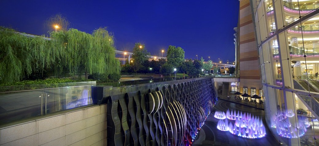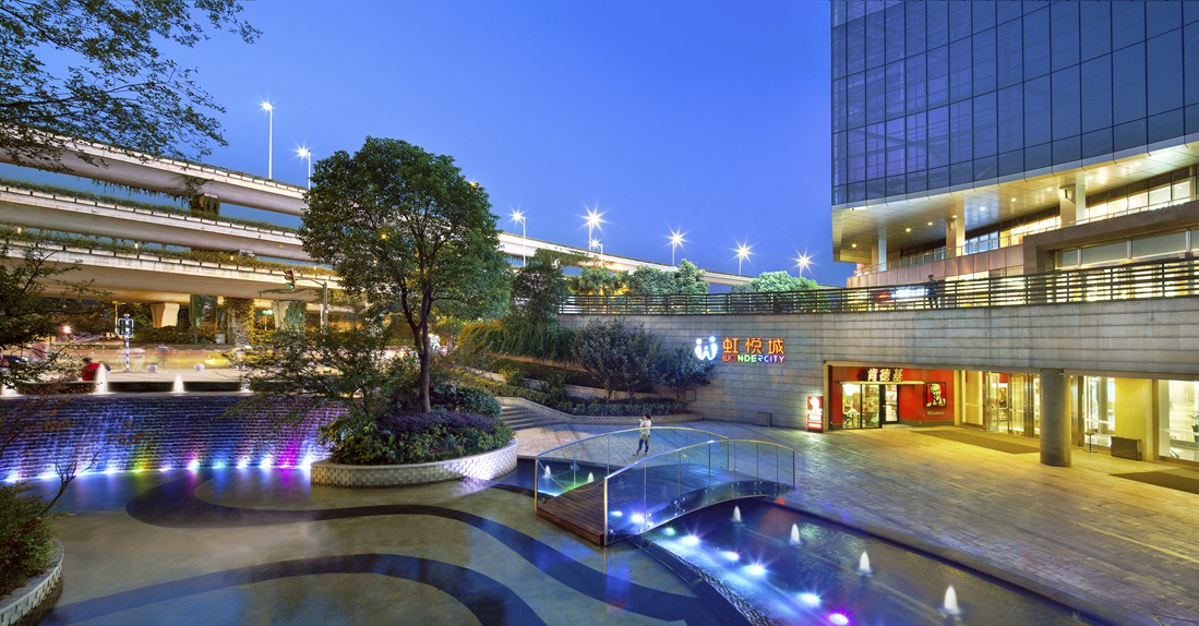 虹悅城是一個(gè)集購物、餐飲、休閑、娛樂、商務(wù)、居家為一體的大型ShoppingMall。在這樣的項(xiàng)目背景下“新的景觀尺度”是這個(gè)項(xiàng)目給我們的一個(gè)挑戰(zhàn),也是一次創(chuàng)新。大尺度的弧線構(gòu)圖,通過水景、綠化、鋪裝設(shè)計(jì)出不同的景觀場景。“立體的設(shè)計(jì)”是這次景觀設(shè)計(jì)的重點(diǎn),現(xiàn)場高差多變;建筑功能不同,景觀將不同的建筑入口有機(jī)的聯(lián)合。有利于商業(yè)經(jīng)營。設(shè)計(jì)手法的統(tǒng)一也是這個(gè)項(xiàng)目的特色,弧形的造型連貫于整個(gè)場地,而這個(gè)弧形元素是通過該項(xiàng)目標(biāo)志中“彩虹”的造型引申設(shè)計(jì)。配合了甲方對整個(gè)項(xiàng)目的形象定位。