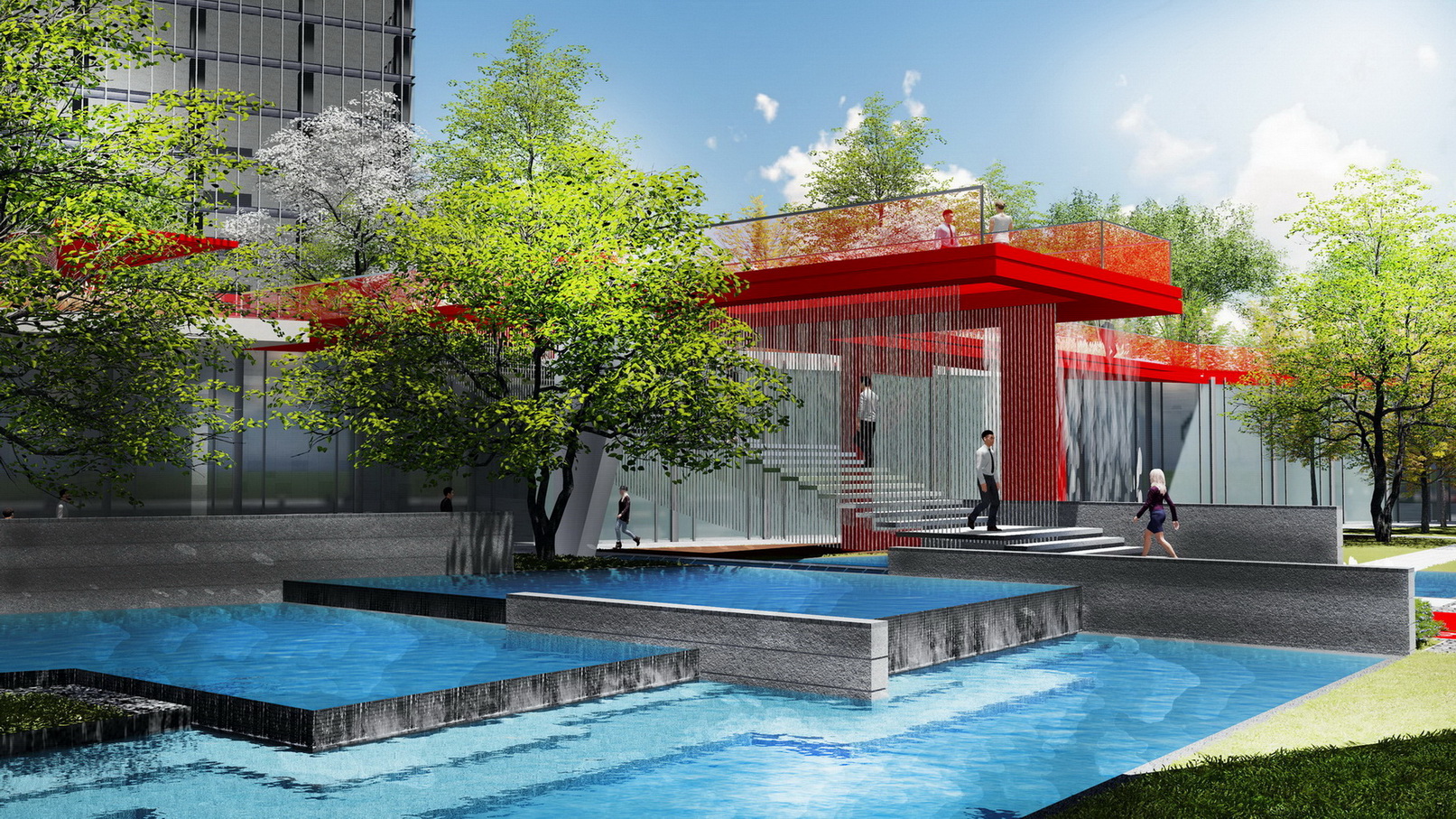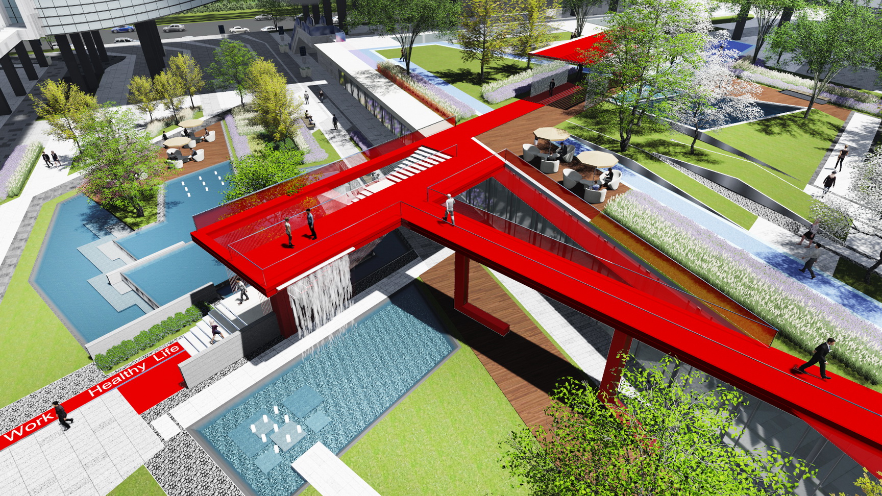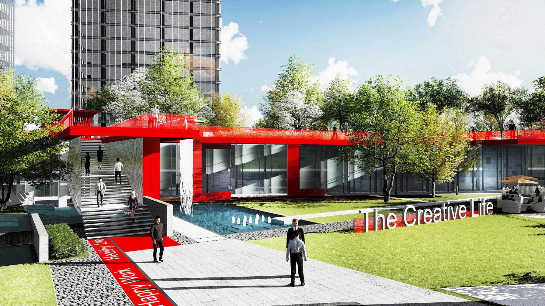 項目為高新科技園區(qū),設(shè)計從商業(yè)、辦公、居住一體化出發(fā),讓綠色聯(lián)動生活。通過景觀帶動商業(yè),景觀為商業(yè)和辦公客戶服務(wù),使建筑、景觀、商業(yè)、人有機地融為一體。通過三維的、立體的、自由飄逸的立體空間網(wǎng)絡(luò)有效整合不同人群的活動需求,營造出更加便捷的工作流線,更加簡約的基礎(chǔ)設(shè)施,更加活躍的共享平臺。同時不局限于傳統(tǒng)園林范疇的感受和體驗,打造可視化的多媒體景觀,極富互動性的開放空間,讓藝術(shù)、教育和公共媒體在此交匯、相融,從而使之躍升成為一個面向未來的項目。