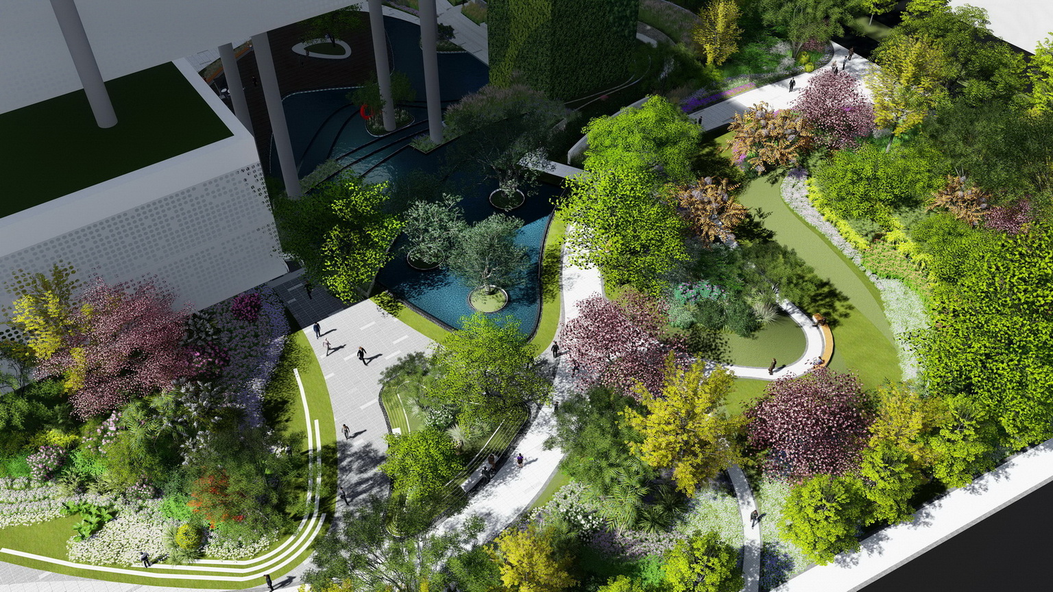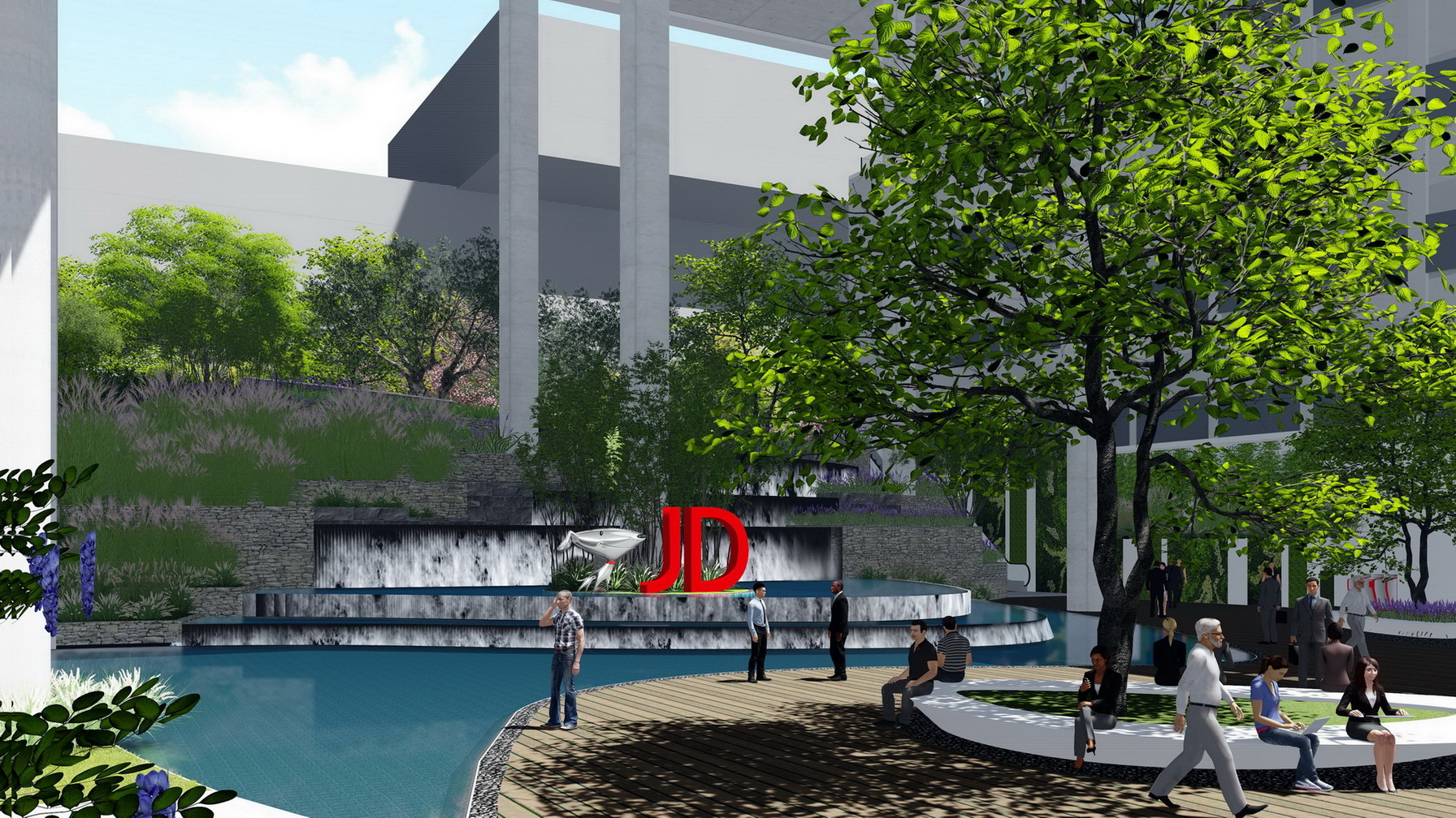 全園傳承京東“便捷”、“智能”、“人性化”的京東精神,打造另一處“辦公區(qū)”——與自然共享的戶外生態(tài)辦公區(qū)。堅(jiān)持人與自然,以人為本的理念,通過一條與自然共享的綠帶貫穿園區(qū)各個(gè)功能區(qū),聯(lián)系工作,聯(lián)系生活,聯(lián)系你我,創(chuàng)造綠色、智能、便捷的多功能景觀空間。景觀的設(shè)計(jì)中,運(yùn)用具有韻律起伏變化的曲線景觀語(yǔ)言設(shè)計(jì),打破了建筑強(qiáng)硬混凝土鋼結(jié)構(gòu)及線條的建筑立面,剛?cè)岵?jì),相互滲透。柔美的曲線在流線中形成蜿蜒曲折的綠地景觀,使得整個(gè)景觀在流動(dòng)中律動(dòng),呈現(xiàn)出行云流水般層次豐富的景觀序列。