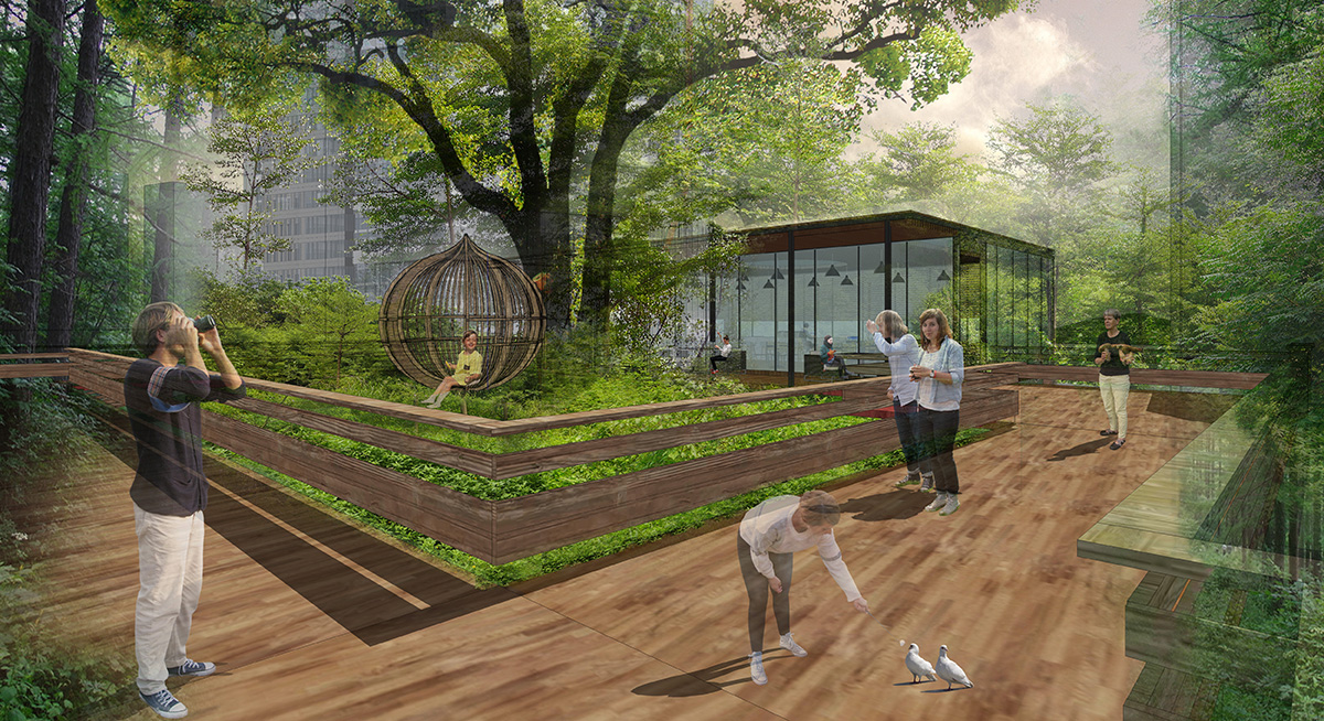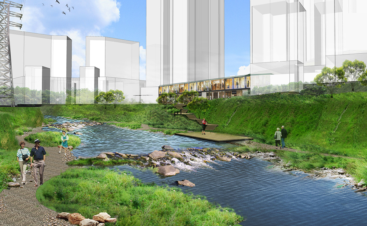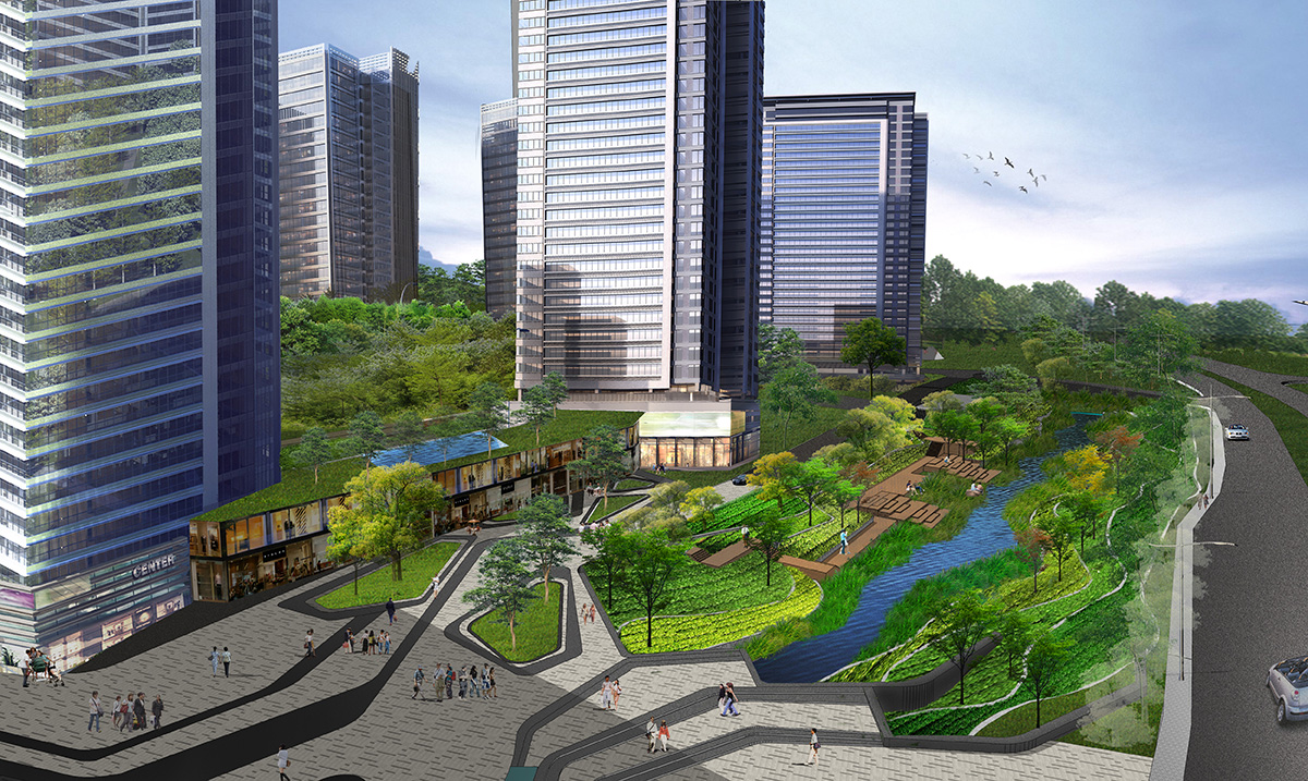 項(xiàng)目主要針對(duì)自然山體的改造與修復(fù)、處理道路與建筑之間的關(guān)系、 山體與道路之間的聯(lián)系、植物的修復(fù)與意向、河涌的整治與雨水的收集問(wèn)題,提出恢復(fù)、聯(lián)系、共生三大設(shè)計(jì)策略。最大限度的保證山體的完整性,保護(hù)原有植物,將道路設(shè)置在建筑架空層內(nèi),將建筑、山體、景觀三者聯(lián)系在一起,讓企業(yè)、商業(yè)、人與自然緊密共生。