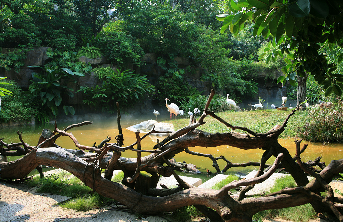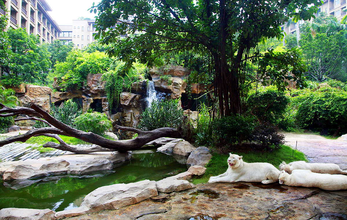 廣州長隆酒店位于長隆5A級(jí)旅游度假區(qū)內(nèi)。本項(xiàng)目為酒店二期工程,由酒店大堂、會(huì)議中心、5 棟多層客房和地下車庫組成。項(xiàng)目把旅游觀光、動(dòng)物觀賞和酒店園林環(huán)境巧妙地融為一體,實(shí)現(xiàn)人與動(dòng)物、植物和諧共處的主題性度假酒店式園林景觀。項(xiàng)目設(shè)計(jì)延續(xù)科學(xué)造園一貫推崇的“自然生態(tài)方向”,強(qiáng)化酒店特殊設(shè)計(jì)主題——“叢林的神秘城堡,嶺南的動(dòng)物王國”,獨(dú)創(chuàng)性營造嶄新的、集酒店住宿、度假休閑、動(dòng)物觀賞等功能于一體的自然山水嶺南庭園。將野生動(dòng)物飼養(yǎng)概念引進(jìn)酒店園林景觀在國內(nèi)尚屬首例,同時(shí)要兼顧考慮動(dòng)物的生活習(xí)性和游人安全性的要求,利用現(xiàn)代高科技和工程技術(shù)手段,巧妙“隱藏”動(dòng)物飼養(yǎng)的“籠”。