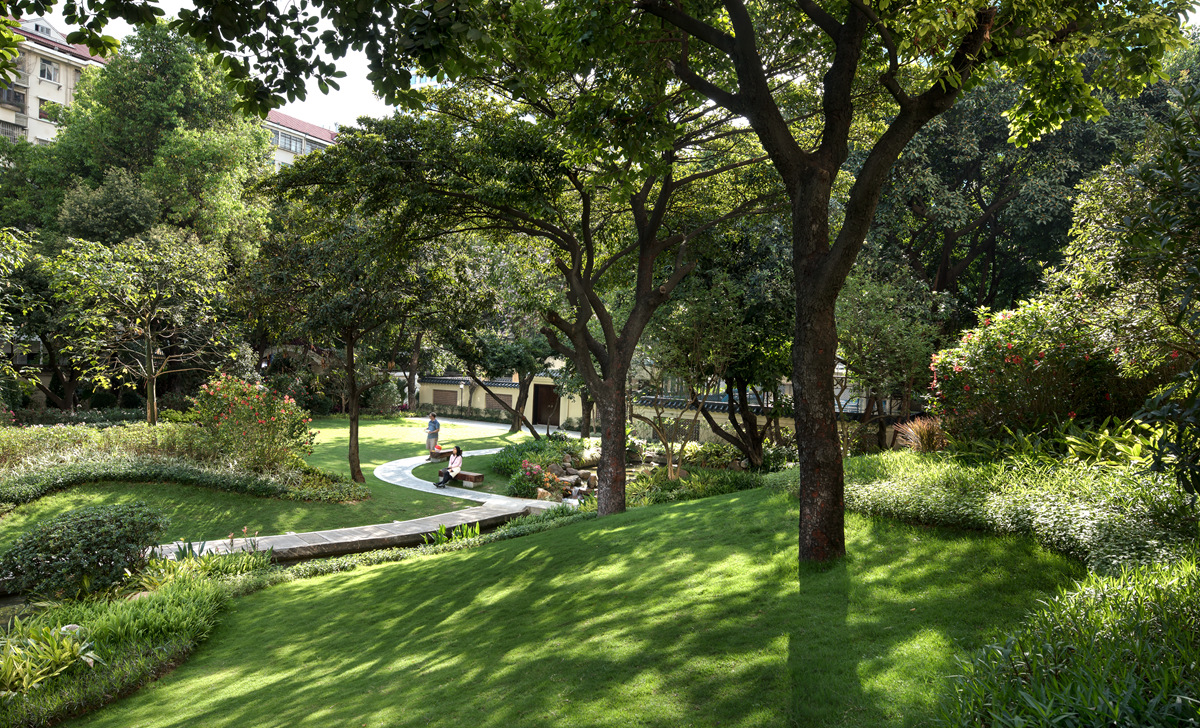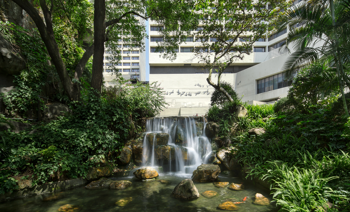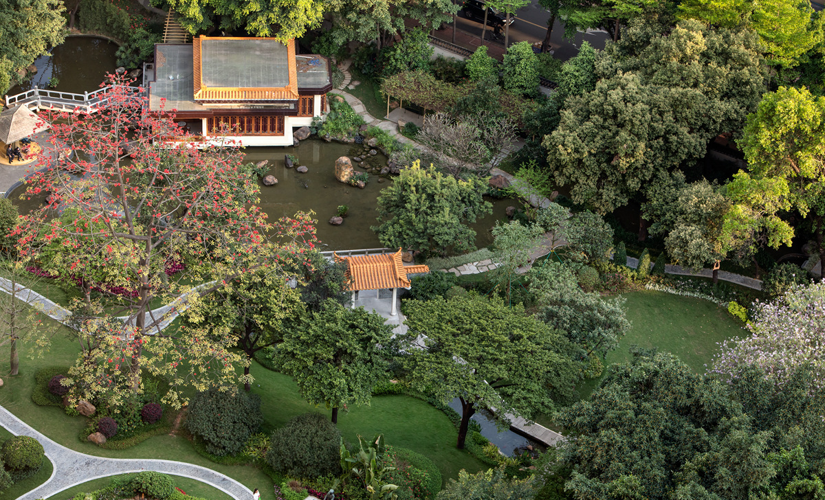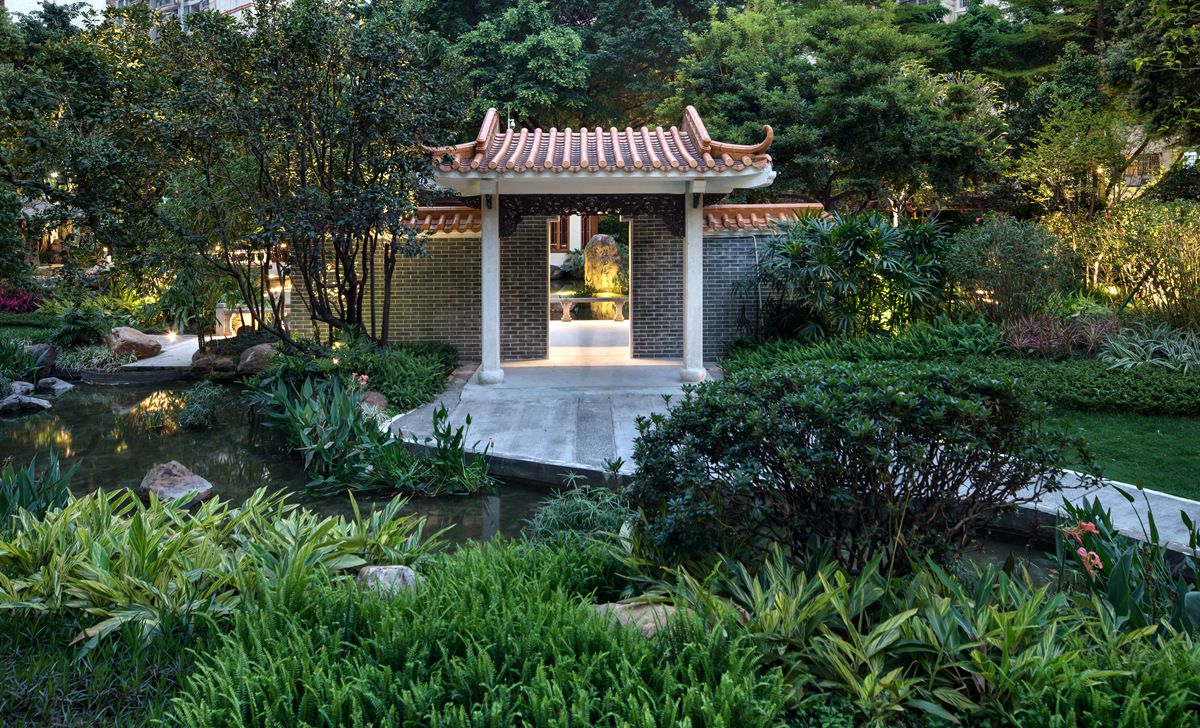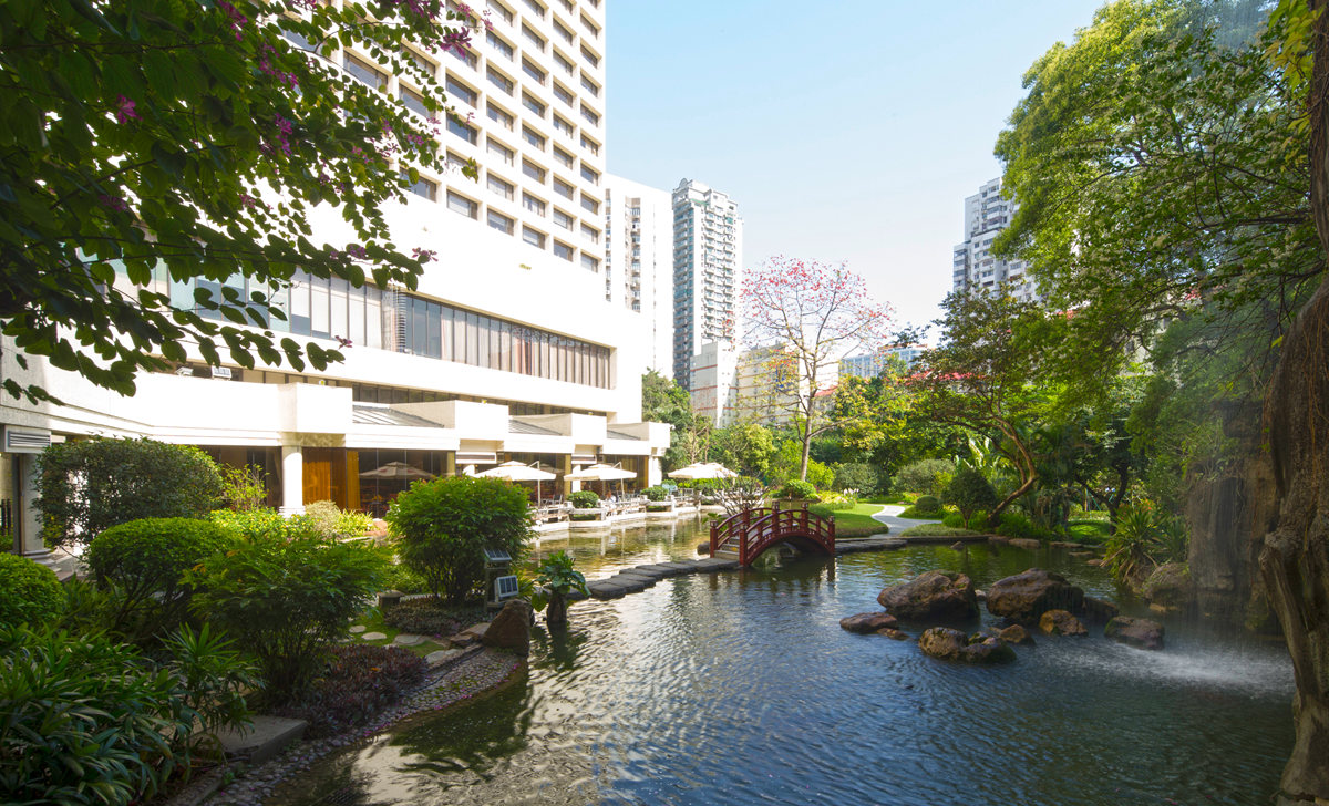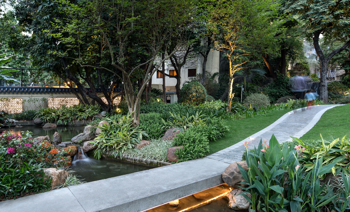 廣州花園酒店位于廣州市中心繁華商業(yè)區(qū),是中國首批、華南地區(qū)唯一的“白金五星級”酒店。項目在改造過程中,緊密圍繞花園酒店“經(jīng)典非凡,中西合璧,回歸自然,貼心服務”展開,充分突出“花”、“園”本義和“花城”特色,強化中西合璧、回歸自然的花園酒店品牌形象。風格上采用中西結(jié)合前西后中的景觀風格,前院入口廣場處以現(xiàn)代簡潔的手法營造舒朗的景觀,而后院則營造中式氛圍庭院,以青磚地鋪代替原本鮮紅的健身散步道,植物采用自然式配置手法,將中式園林以小見大步移景異的空間手法與傳統(tǒng)意境的植物如蘇鐵、蕨類等結(jié)合,在咫尺空間中將森林、草坪、溪澗、瀑布、湖泊等自然景象濃縮在一園之中,形成意境深遠的中式園林空間。