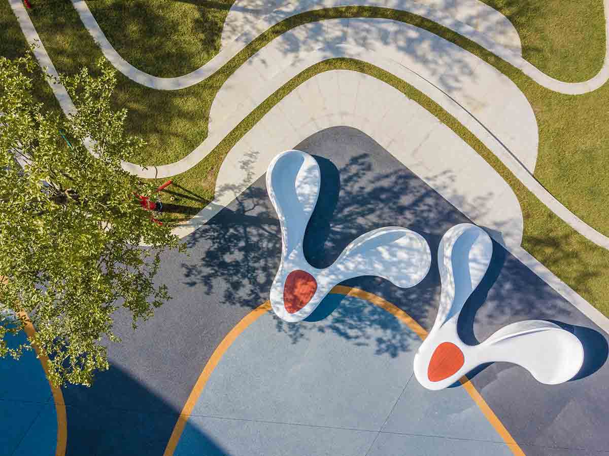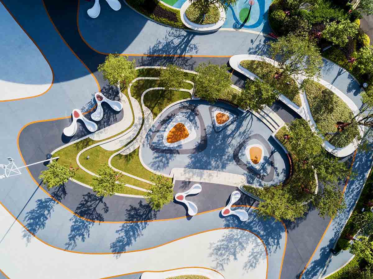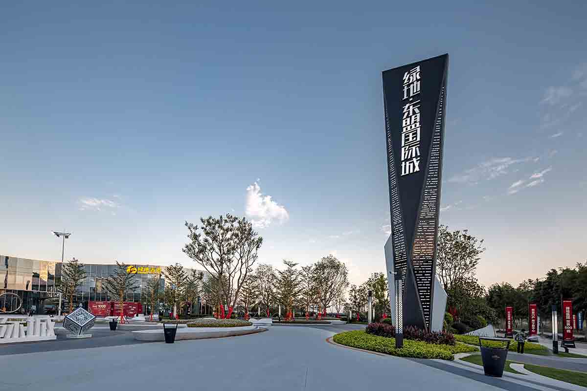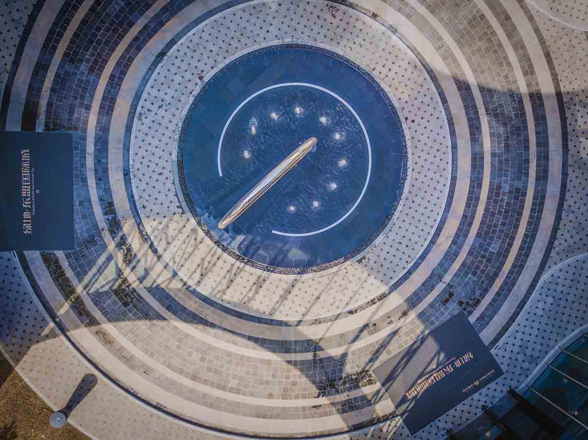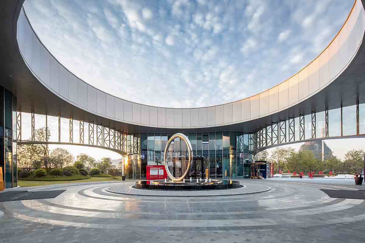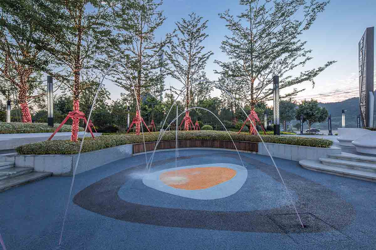 東盟國際城位于優(yōu)美的里建湖群。景觀設(shè)計從場地地脈入手,將“水”引入其中,通過提取自然界中湖泊的特征元素,將其景觀化處理并融入空間。項目從平面藝術(shù)的構(gòu)圖出發(fā),仿造水紋動感流線之形,大量運用曲線元素,打造園區(qū)整體性鋪裝。結(jié)合光帶打造出“行云流水”的景觀視覺感受;同時采用藝術(shù)裝置、燈光的設(shè)計凸顯園區(qū)景觀的藝術(shù)氛圍。