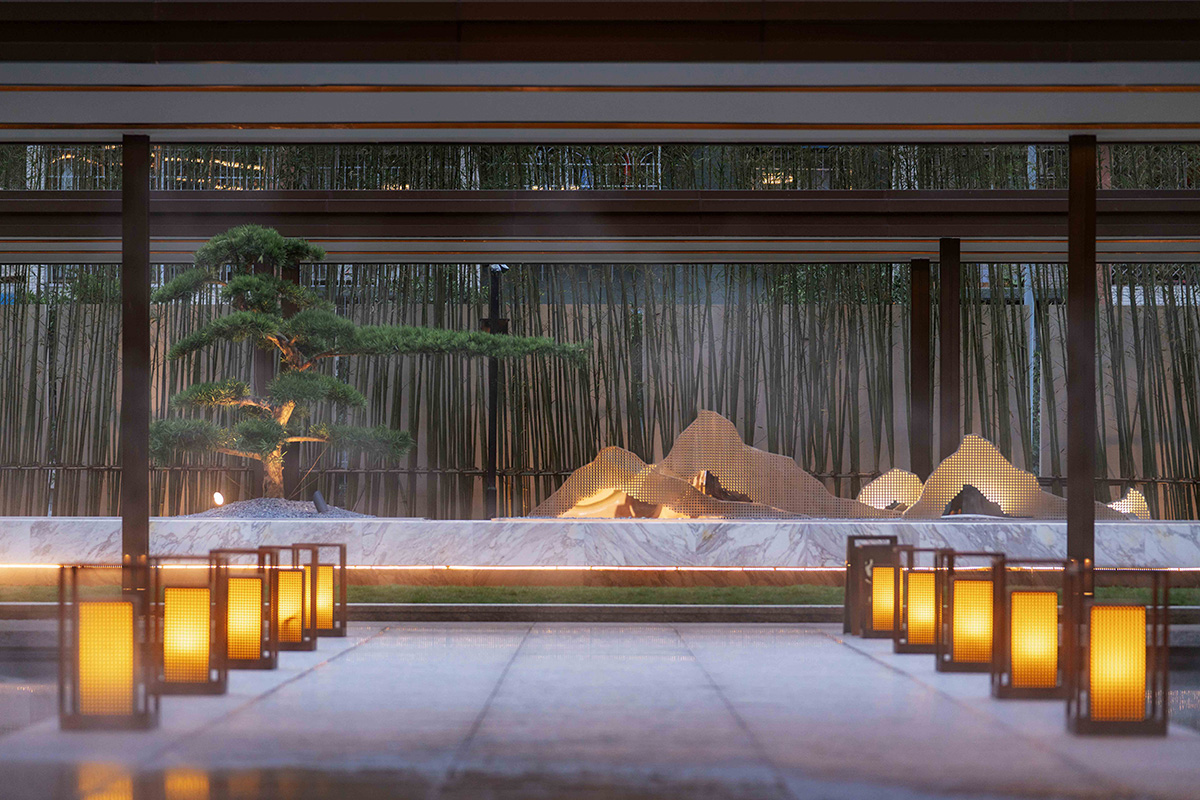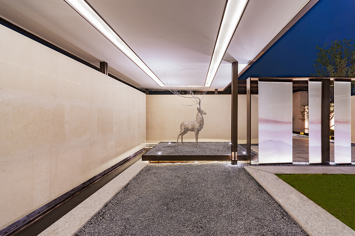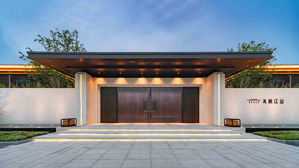 金科禮悅江山以“人的精神文化追求”為線索出發(fā),確切地考慮地域生活行為習(xí)慣及這一代人新的生活方式,通過段落式的景觀營造生活所需要的儀式感。項(xiàng)目以差異式手法營造段落式景觀,入口前庭以延伸式水景及景墻營造奢華尊享的初印象,中庭結(jié)合中式枯山水打造靜謐、雅致的庭院景觀,后庭以大面積鏡面水景形成靜謐、尊貴的空間。