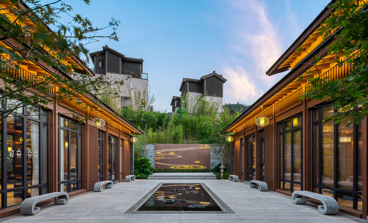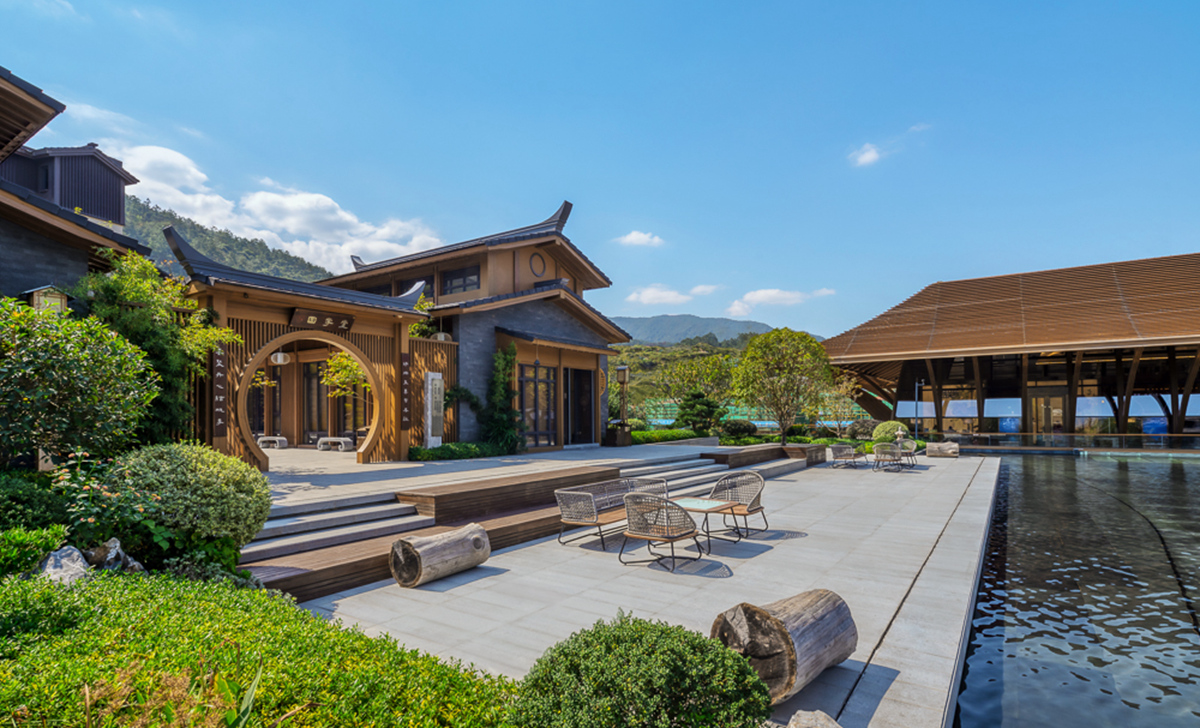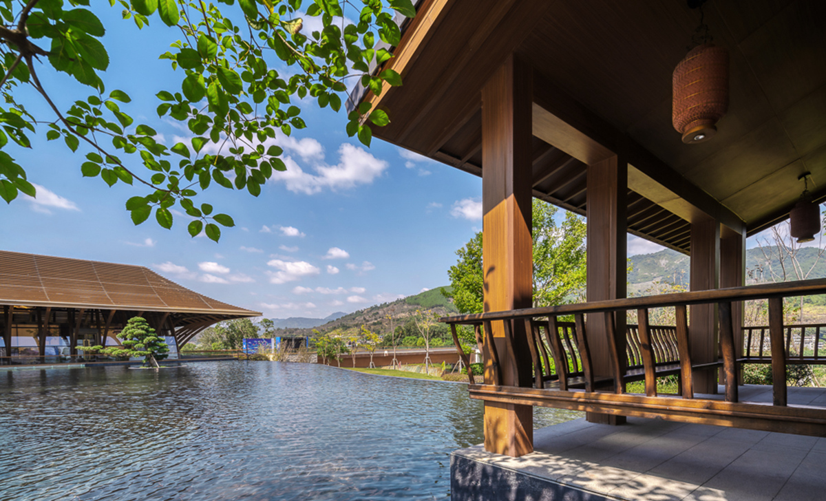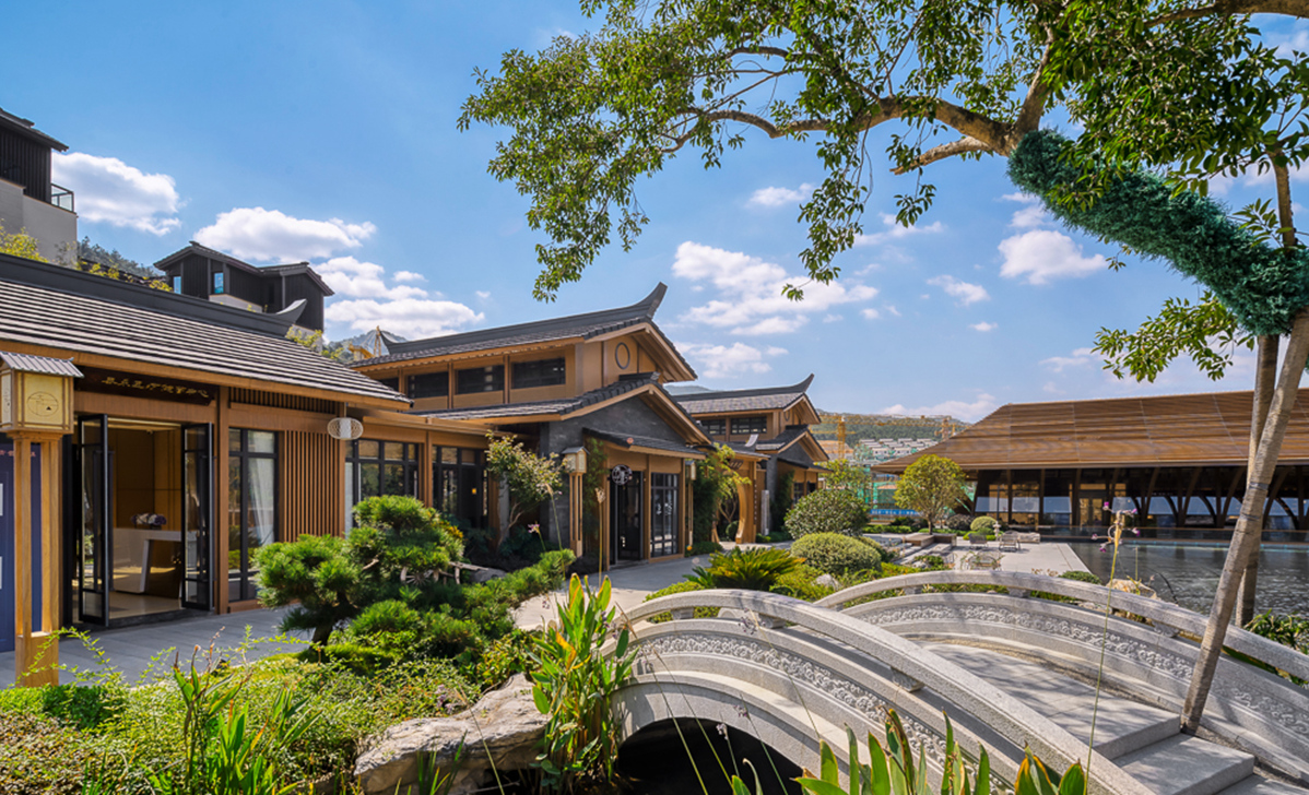 福州泰禾青云小鎮(zhèn)是福州唯一一個以中式院落文化為基礎(chǔ)的小鎮(zhèn)項目。項目三面環(huán)山,一面臨水,景觀整體以“山水院子,中式文化”為設(shè)計主題,采用景觀遞進和移步換景的手法,循山造景,引水入園。室外的亭、廊、觀景臺、眺望臺等半室外空間依水而建,頗有小橋流水人家之境。舒展開闊的線條,模糊了水景、園路、眺臺、連廊等室內(nèi)外空間的界限,將環(huán)境融入建筑,強化空間感受。