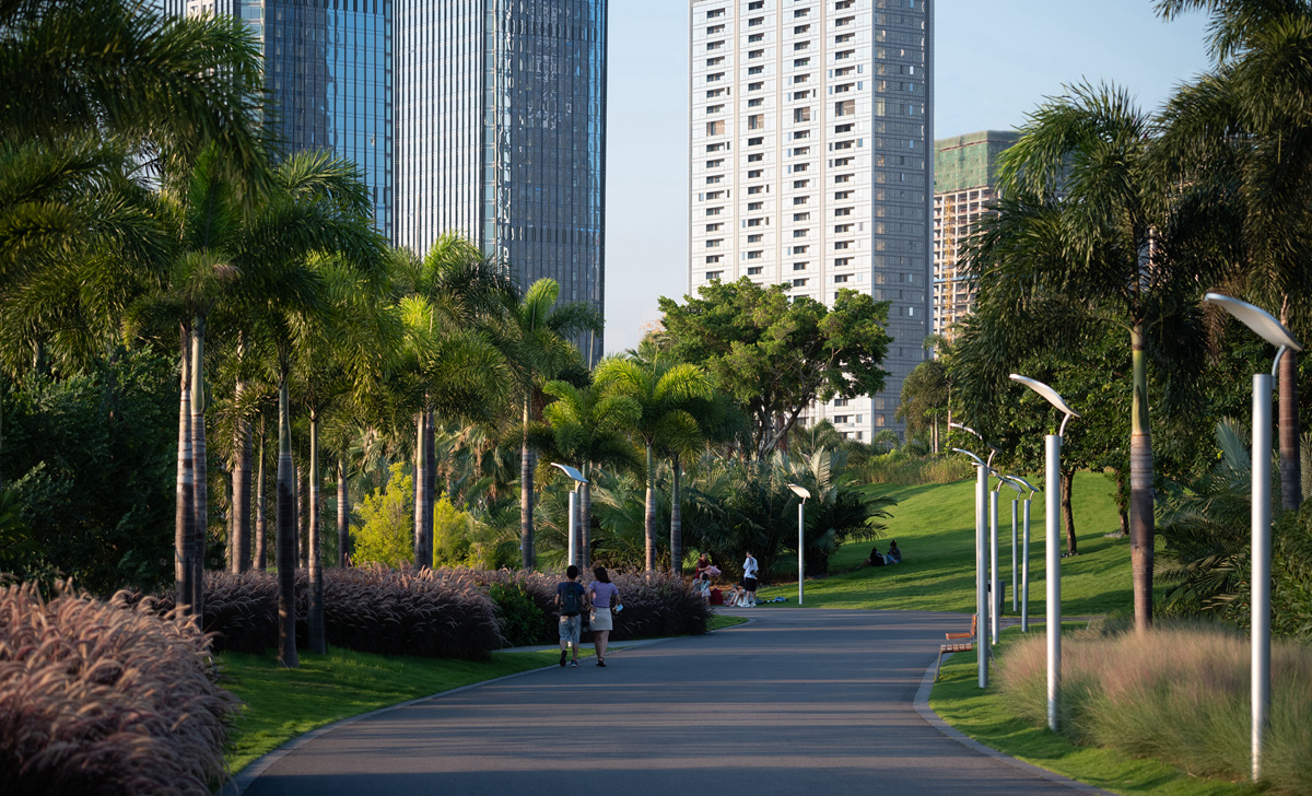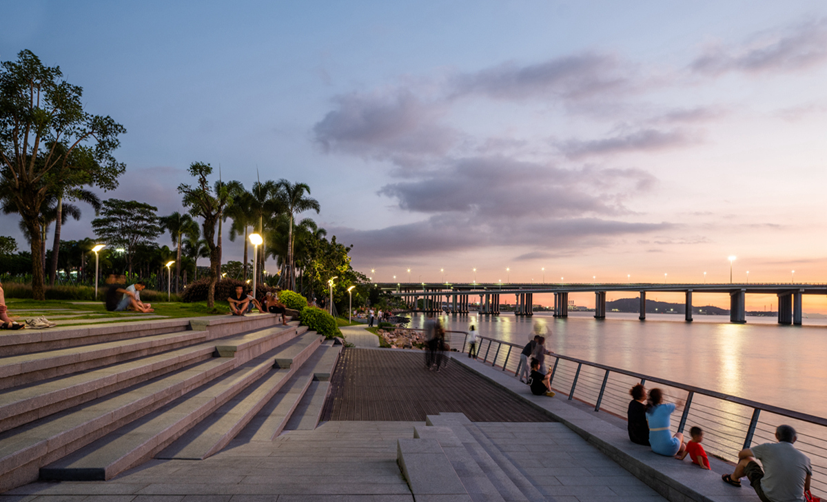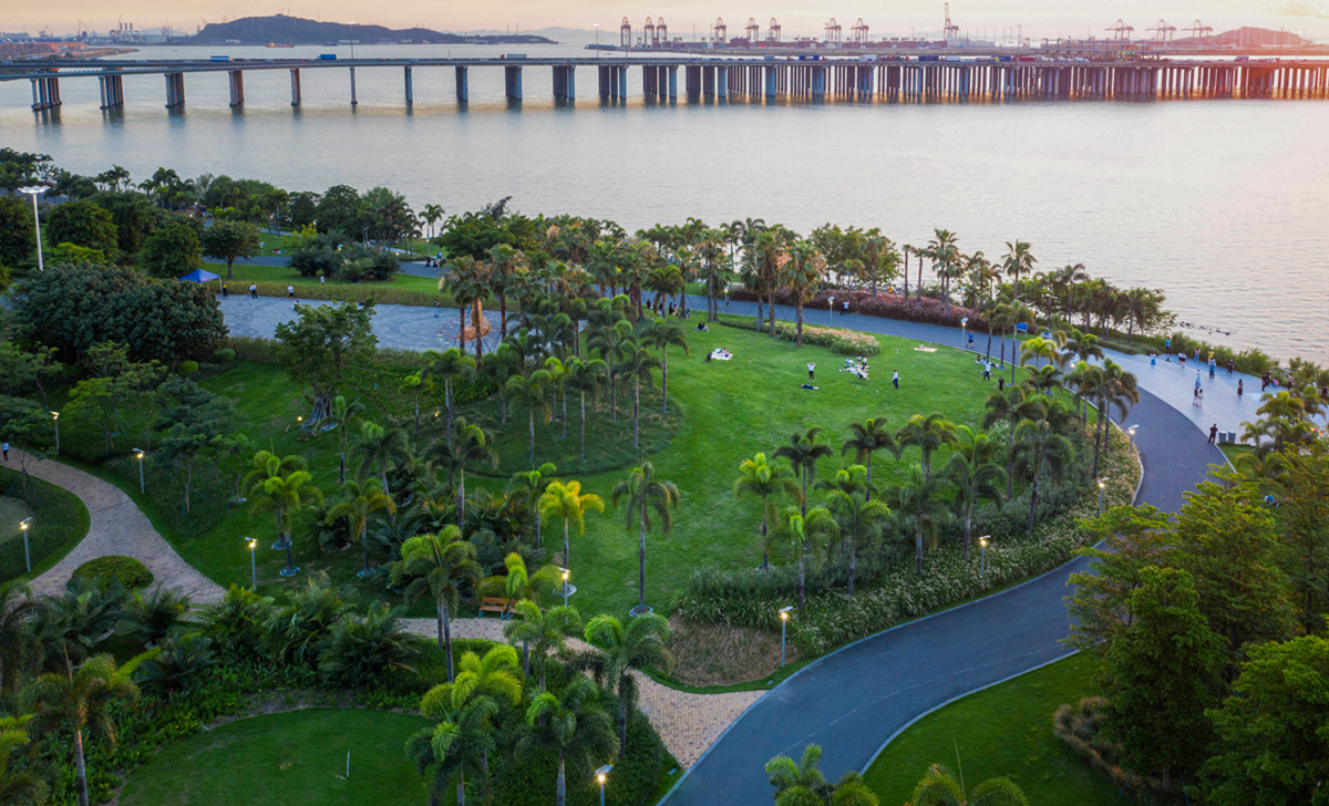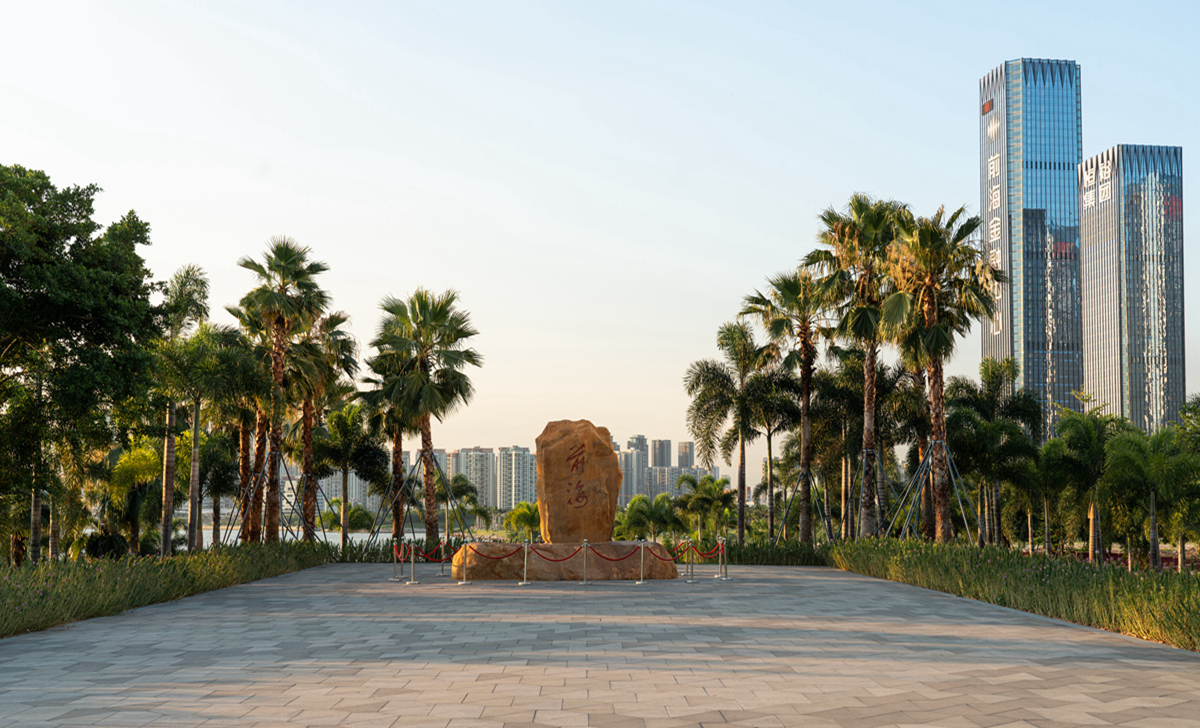 六年前,習(xí)近平總書(shū)記廣東考察的第一站就是深圳前海。當(dāng)時(shí),前海還是一片熱火朝天的工地。六年后,習(xí)總書(shū)記又來(lái)到了前海,他特意再次來(lái)到前海石公園,察看前海的發(fā)展變化。昔日的灘涂,如今,樹(shù)影婆娑、綠草如茵、高樓林立,一派勃勃生機(jī)。前海石公園由我司負(fù)責(zé)景觀設(shè)計(jì)及施工,主要包括前海石觀景平臺(tái)、周邊綠化及濱海景觀帶三部分。其中,前海石觀景平臺(tái)呈狹長(zhǎng)帶狀,南北縱向軸長(zhǎng)96米,東西橫向?qū)?6米,軸線坐北朝南偏西9度,是社會(huì)各界人士爭(zhēng)相觀摩的紀(jì)念地。前海石歷經(jīng)滄桑,已成為前海最具代表性的標(biāo)志物,承載著前海精神,見(jiàn)證特區(qū)改革開(kāi)放再出發(fā),象征著前海改革發(fā)展的新時(shí)代、新高度。前海石廣場(chǎng)是以專家顧問(wèn)組、廣州美術(shù)學(xué)院陳克教授提出“一石激起千層浪”概念為設(shè)計(jì)依據(jù),項(xiàng)目組多次奔赴英德等地篩選基石,最終選擇與前海石同樣材質(zhì)的景石,并制作前海石泥稿,模擬推敲設(shè)計(jì)效果。同時(shí),項(xiàng)目組為前海石景石的吊裝、修復(fù)做出多個(gè)操作方案,最終選定橫向放置景石臨時(shí)遷移存放的方案,以確保前海石的萬(wàn)無(wú)一失。吊裝結(jié)束后對(duì)前海石進(jìn)行了深度保養(yǎng)修補(bǔ)工作,用時(shí)三天,涵蓋清洗、風(fēng)干、專用膠修補(bǔ)、拋光、刷漆等十道工序。公園的鋪裝設(shè)計(jì)亦延續(xù)“一石激起千層浪”的設(shè)計(jì)理念,以前海石為中心點(diǎn),向廣場(chǎng)四周泛起波浪,鋪裝材料采用特殊定制的不規(guī)則四邊形高強(qiáng)度抗壓透水磚,結(jié)合參數(shù)化設(shè)計(jì)的互扣式拼裝工藝,分為深、中、淺三個(gè)顏色,象征著前海工作者“深入淺出”的學(xué)習(xí)與踐行態(tài)度。