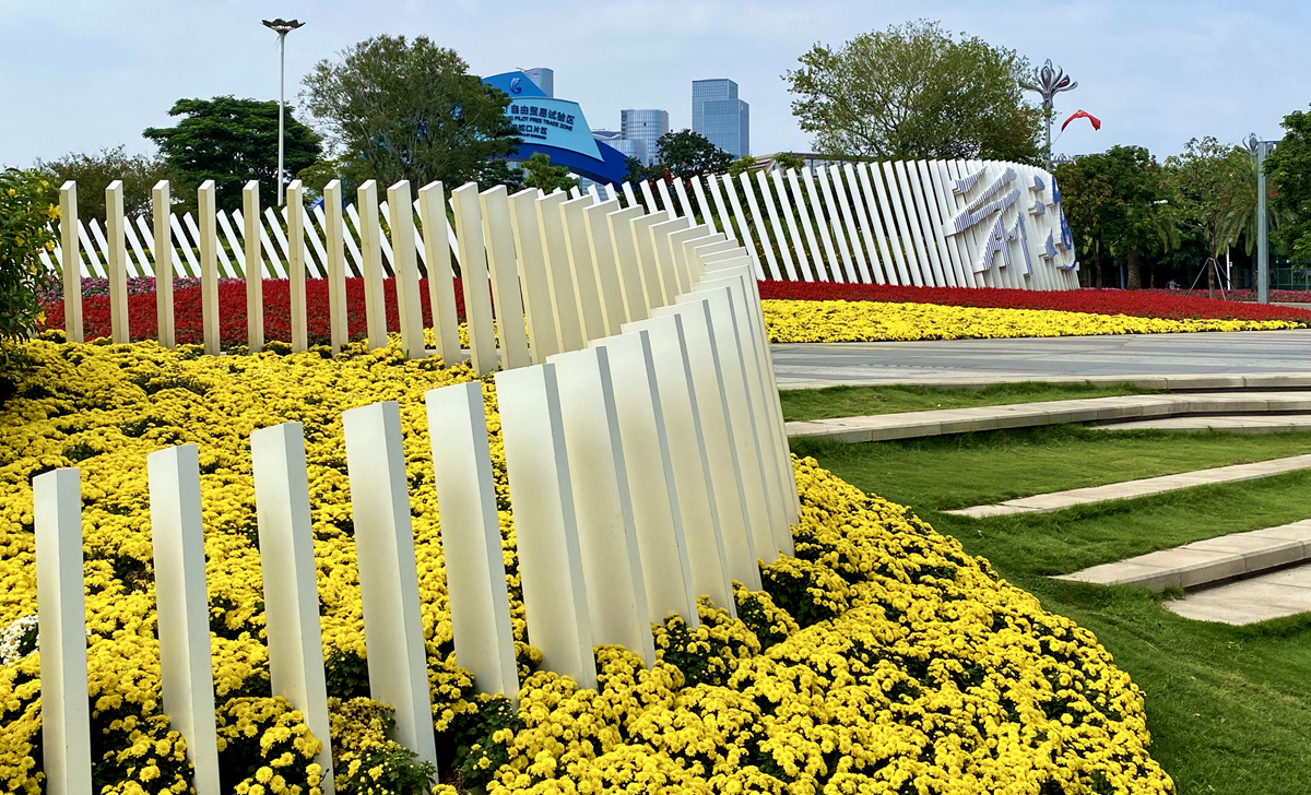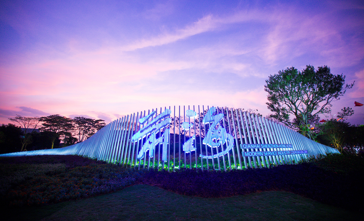前海門戶公園是前海標(biāo)志性入口公園,代表前海形象,迎接八方來賓。高低起伏的地形創(chuàng)造出空間多樣變化,流暢的地形中以常綠喬木為背景,下層打造近千平米的絢麗燦爛花境,以此烘托出大型城市藝術(shù)裝置“前海潮”,彰顯前海在改革浪潮中敢為人先的決心。 為了展示前海主題,主體景觀“前海潮”采用波浪形的白色格柵,中間嵌著由深圳總設(shè)計師鄧小平先生親提的“前?!眱蓚€藍(lán)色大字。為了將“前?!倍肿龀鏊囆g(shù)感和儀式感,項目組將二字做到了3米多高,并采用“化整為零”的方法,將字變成小塊的格柵,使之更有韻律和時代感。在制作方面,考慮到承重與美觀,選擇了高質(zhì)量的不銹鋼作為格柵的原材料。為保證每一條格柵長度的精確性,所有的材料都親自沖壓、安裝,并要求雕塑師全程跟進(jìn),保證控制每一根管的傾斜度。