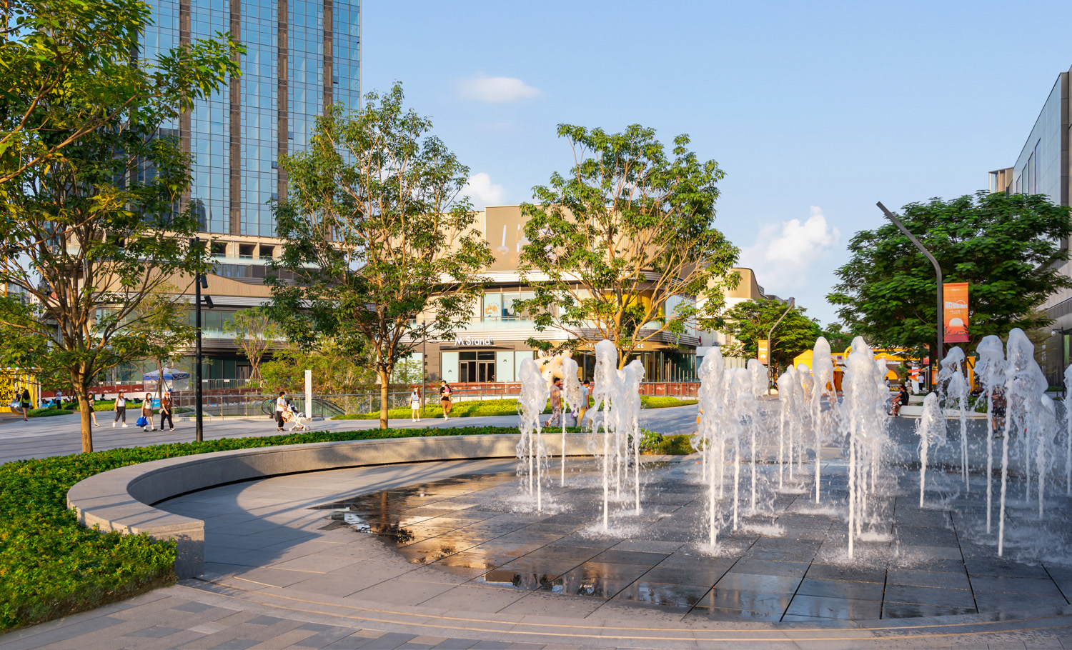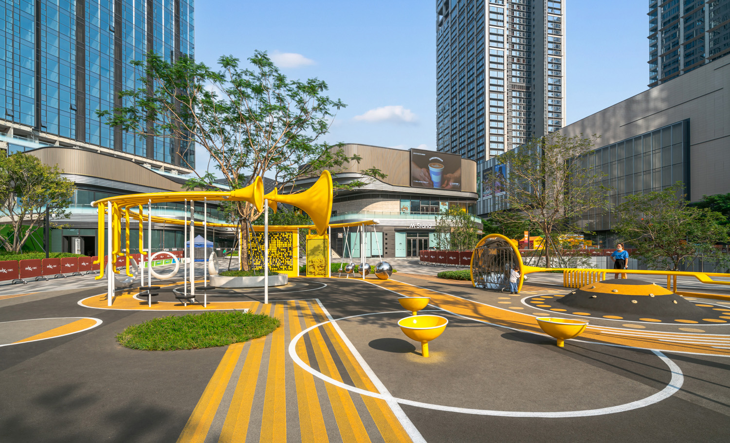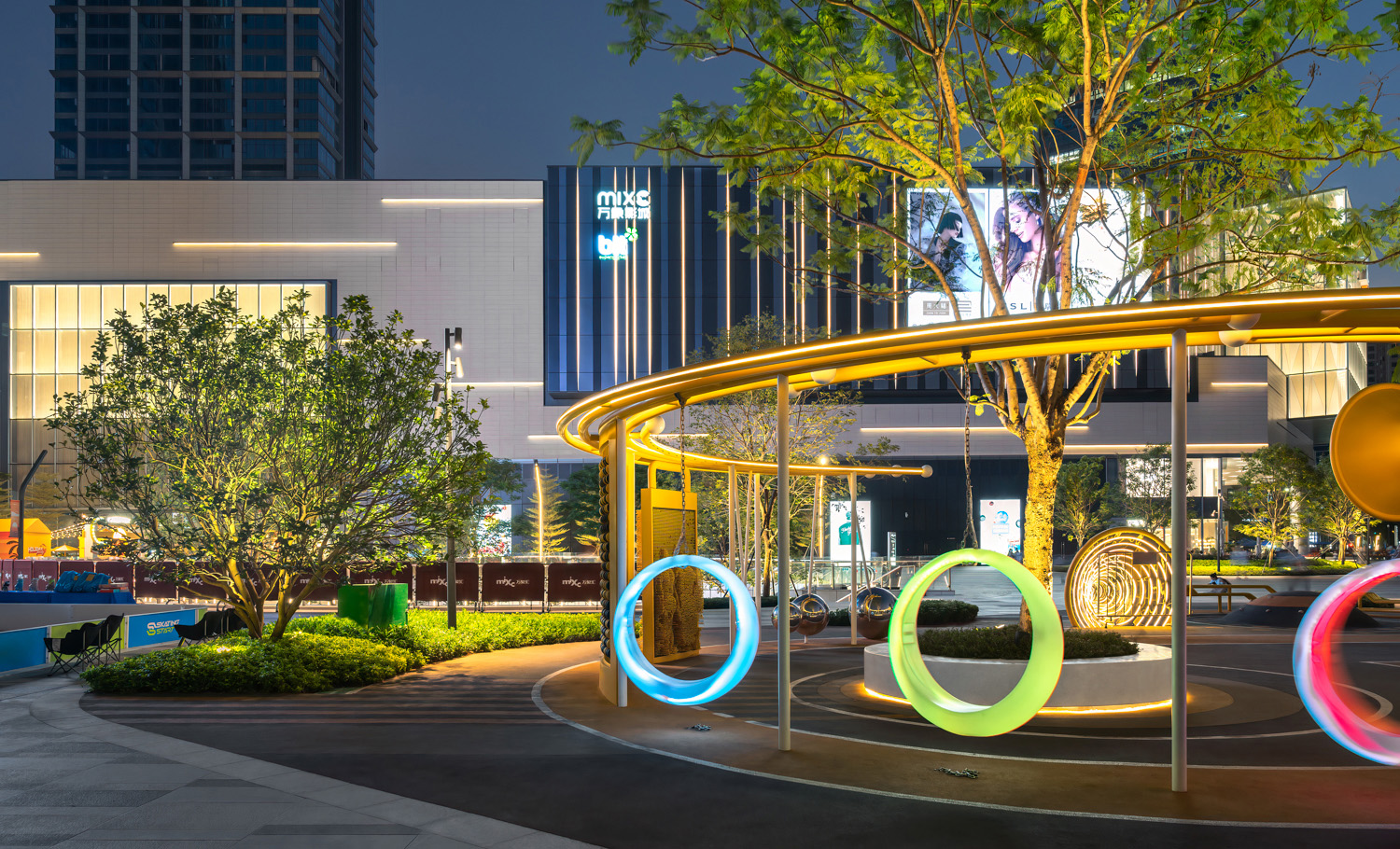 松山湖萬象匯延續(xù)城市綠色脈絡(luò),在原有綠地肌理上嵌入便民功能空間,將中軸核心步行街作為景觀重點,通過空間尺度研究,并采用循環(huán)永動的“圓”作為空間結(jié)構(gòu)構(gòu)建起一系列場景,將“圓”融入鋪裝和景觀元件之中,定義商業(yè)空間,連接起商業(yè)室內(nèi)外空間的過渡,將人氣向內(nèi)聚于圓中,強(qiáng)調(diào)項目的獨特形象和記憶點。