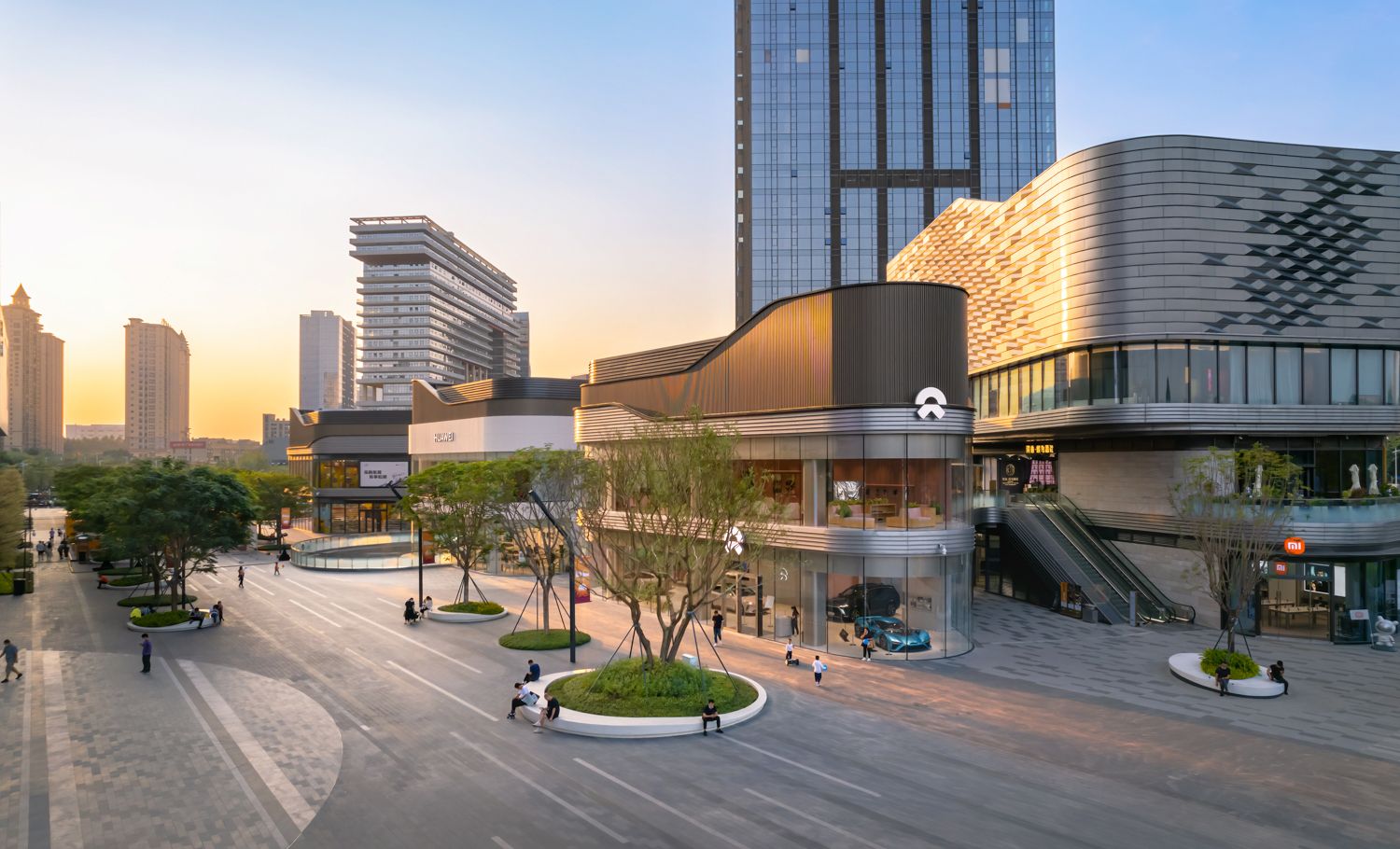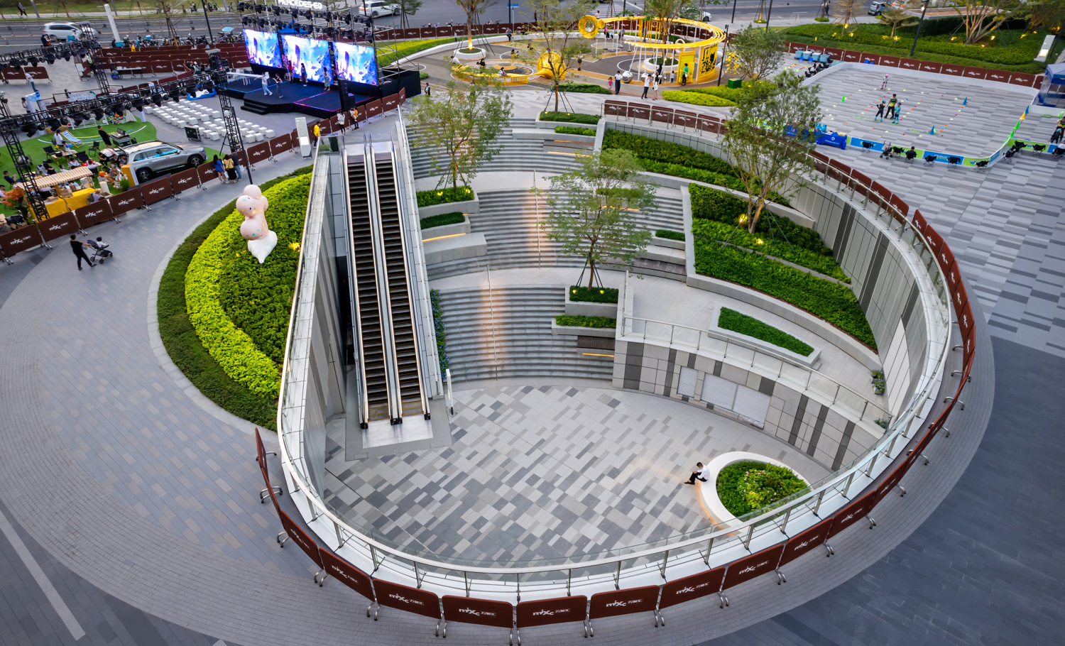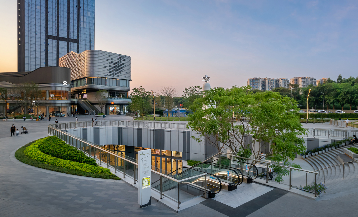 松山湖萬象匯延續(xù)城市綠色脈絡(luò),在原有綠地肌理上嵌入便民功能空間,將中軸核心步行街作為景觀重點,通過空間尺度研究,并采用循環(huán)永動的“圓”作為空間結(jié)構(gòu)構(gòu)建起一系列場景,將“圓”融入鋪裝和景觀元件之中,定義商業(yè)空間,連接起商業(yè)室內(nèi)外空間的過渡,將人氣向內(nèi)聚于圓中,強(qiáng)調(diào)項目的獨特形象和記憶點。