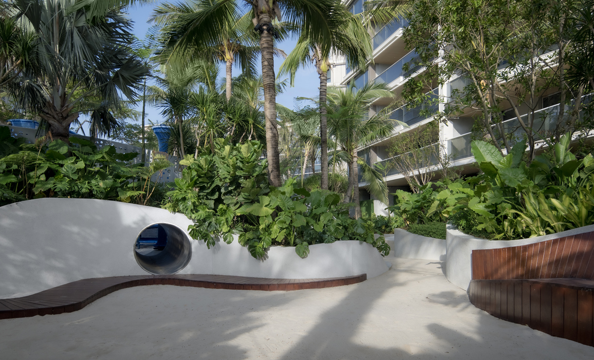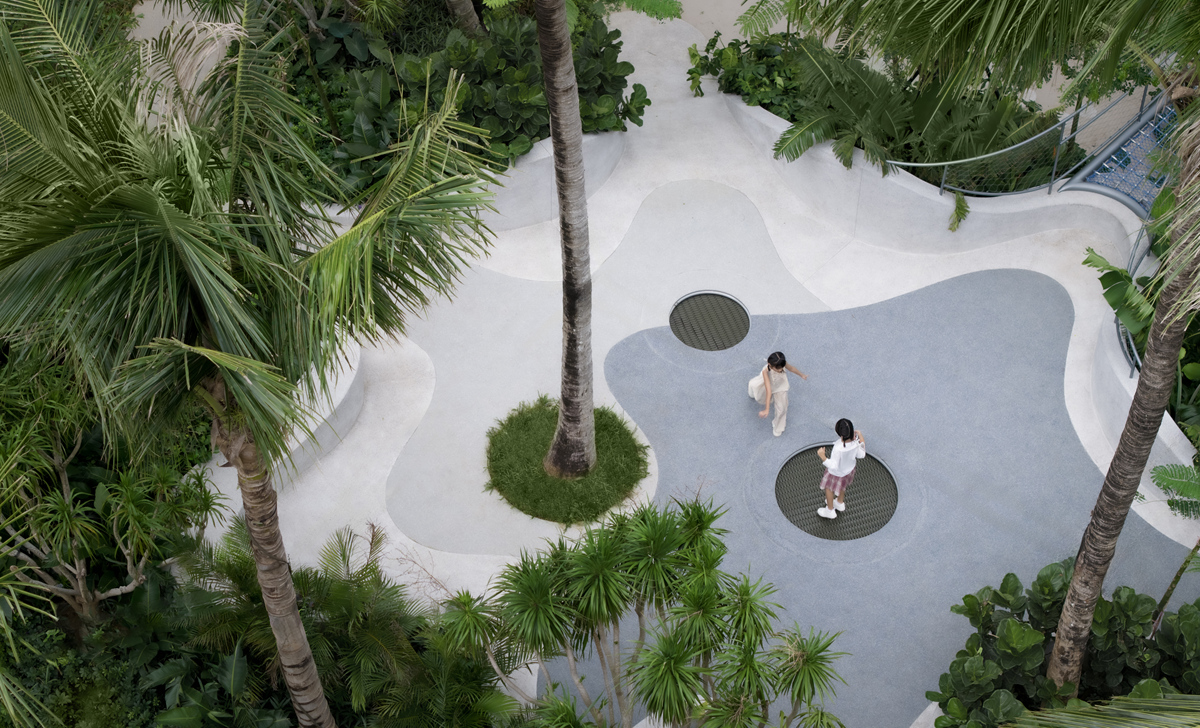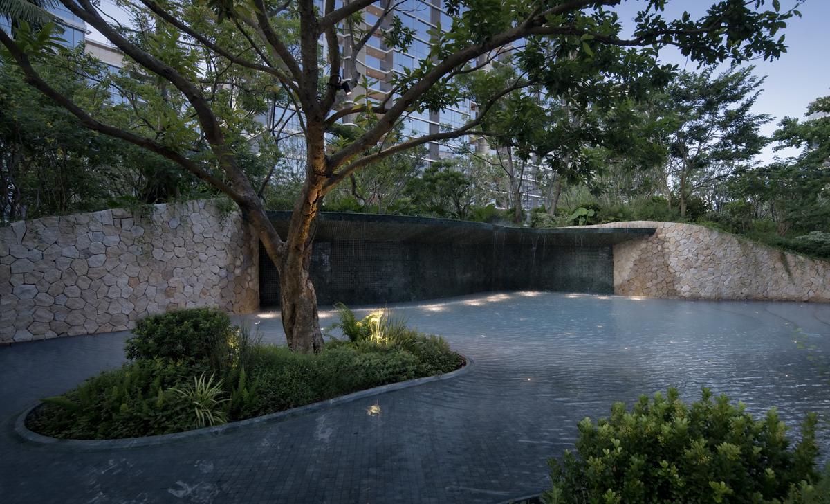 三亞華潤海棠悅府中區(qū)為項(xiàng)目核心區(qū)域,面積約29000㎡,由普邦股份承接景觀施工,融合“山囿”主題,重構(gòu)人與自然的親密連接,打造出一片兼具國際視野與在地風(fēng)情的旅居秘境。項(xiàng)目巧妙化解場地的復(fù)雜高差,以流暢的曲線將空間局限扭轉(zhuǎn)為景觀亮點(diǎn);尊重自然生態(tài)環(huán)境,以山、水、石、林、廊等元素勾勒出山環(huán)水繞的熱帶意境。園區(qū)內(nèi)利用下沉庭院和堆坡造景,營造“迷霧森林”般意境,并設(shè)置流云形態(tài)的礫石步道,帶來雨林探索的趣味;在下沉庭院側(cè)上方打造超長的泳池,另一側(cè)則打造“海星山谷”般的星海主題兒童活動(dòng)區(qū),為全球旅居者營造出沉浸式、探險(xiǎn)感、驚喜不斷的度假體驗(yàn)。